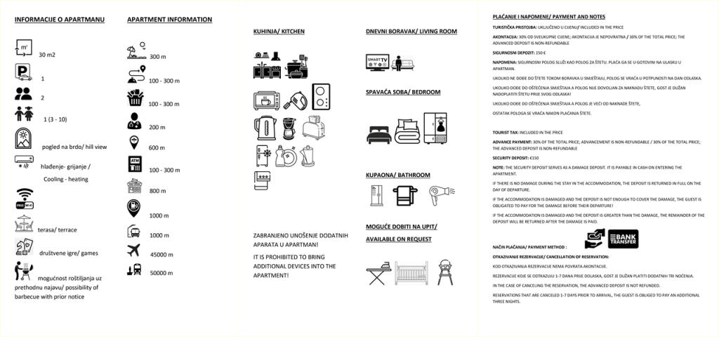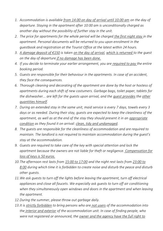 En savoir plus Unités d'hébergementJusqu'à TROIS nuits, le prix est 30 % PLUS CHER ; LA PERSONNE SUPPLÉMENTAIRE paie 10 € par nuit, selon la saison. HEURE D'ARRIVÉE : après 14h00 ; HEURE DE DÉPART : jusqu'à 10h00 ; L'AVANCE est de 30 % du montant total, le reste à l'arrivée à l'appartement ; LA CAUTION POUR DOMMAGES est de 150 €, le client la paie à l'arrivée à l'appartement, si rien n'est cassé, elle est restituée au départ ; La maison dispose d'UNE PLACE DE STATIONNEMENT pour chaque appartement ; IL EST INTERDIT : d'amener des personnes qui ne sont pas utilisatrices du logement, de faire du bruit entre 15h et 17h et 23h et 20h, d'amener des animaux de compagnie. Nous sommes fermés du 31.10.. au 15.03. Nous acceptons les réservations pour 2026 à partir du 1.01.2026.