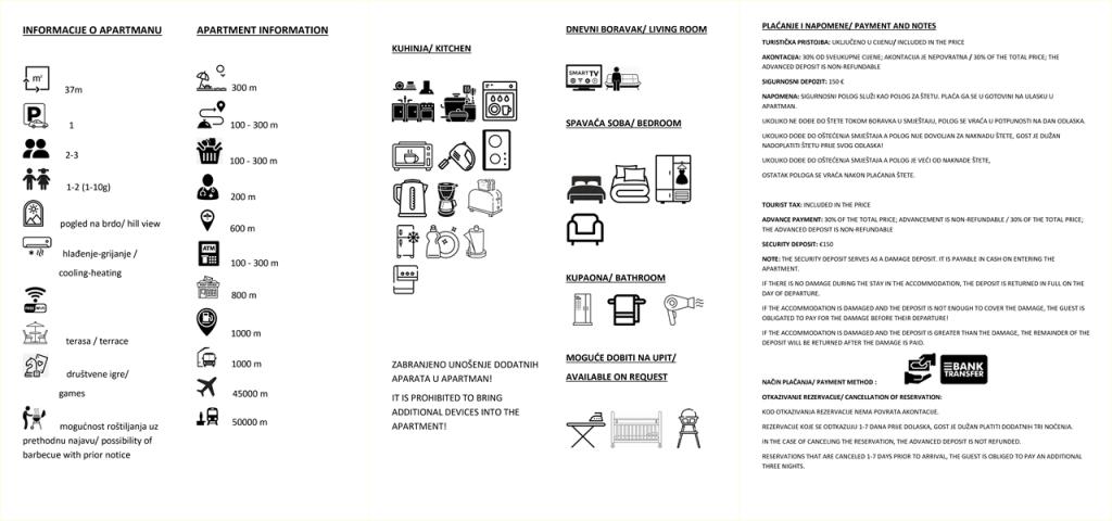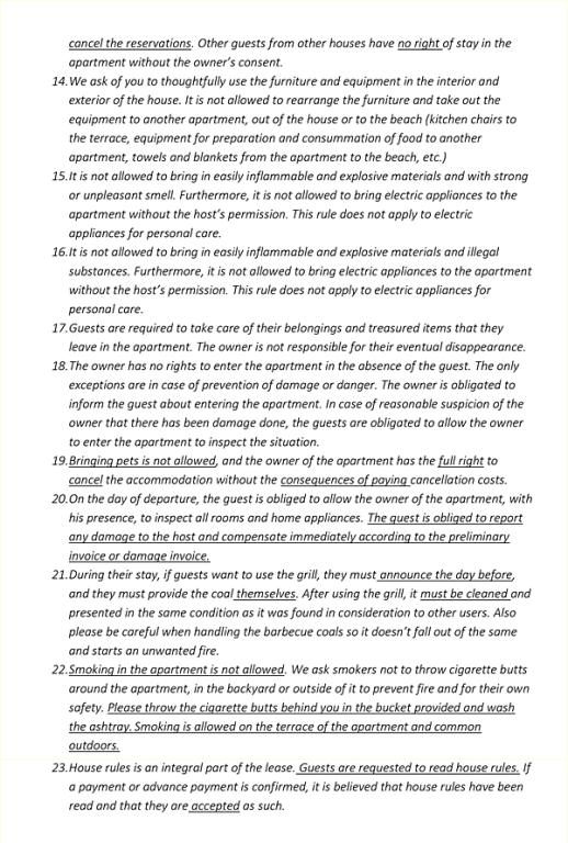 Taxe de sejour est inclus dans le prix.L'acompte est le montant versé par le locataire sur le compte du propriétaire de l'appartement. Il garantit son arrivée au propriétaire et la réservation de l'appartement pour une date et un nombre de personnes déterminés. Il constitue également une indemnisation en cas de non-présentation. Un acompte de 30 % du prix total est prélevé et non remboursable. Le solde est réglé par le locataire à son entrée dans l'appartement. Après paiement et enregistrement, la facture est remise et les documents sont restitués. À son arrivée, le locataire verse une caution de 150 € en cas de dommages, qui lui est restituée le jour du départ si aucun dommage n'a été causé. En cas de dommages, la caution reste acquise au propriétaire de l'appartement pour couvrir les dommages à hauteur du montant total. Si le montant des dommages est supérieur au montant de la caution, le locataire est tenu de régler immédiatement. En cas de résiliation anticipée, le locataire est tenu de régler la totalité du montant. En cas de violation du règlement intérieur, l'agence ou le propriétaire de l'appartement a le droit d'annuler la réservation, et le montant du lendemain jusqu'à la fin du séjour est restitué