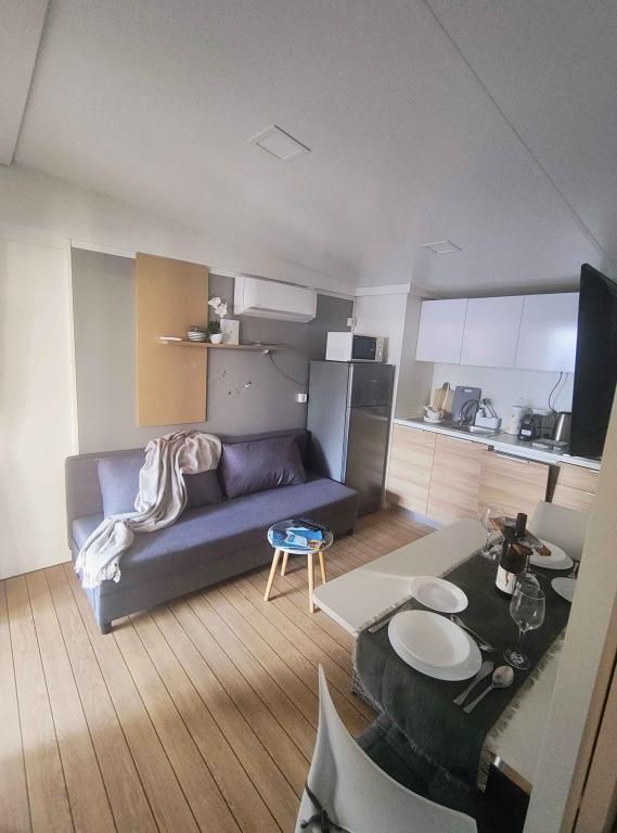 Notre mobil-home moderne offre un hébergement confortable pouvant accueillir jusqu'à 7 personnes. Il comprend deux chambres spacieuses, un salon avec canapé-lit et deux salles de bain. Profitez de la grande terrasse couverte équipée d'un coin repas et d'un salon de jardin, idéal pour de longues soirées conviviales, autour d'un grand barbecue à gaz et d'un réchaud. La terrasse couverte est entourée de pins et baignée par la douce brise marine. D'un côté, vous trouverez un spacieux coin repas, et de l'autre, un salon de jardin avec un coin salon confortable et une balançoire en forme d'œuf pour un moment de détente optimal. De plus, dans l'espace ouvert, vous pourrez profiter du soleil ou de l'ombre, sur une grande chaise longue confortable avec une petite table, où vous pourrez déguster des cocktails, une boisson fraîche ou lire un livre. La maison est située à 3 minutes d'une magnifique plage.