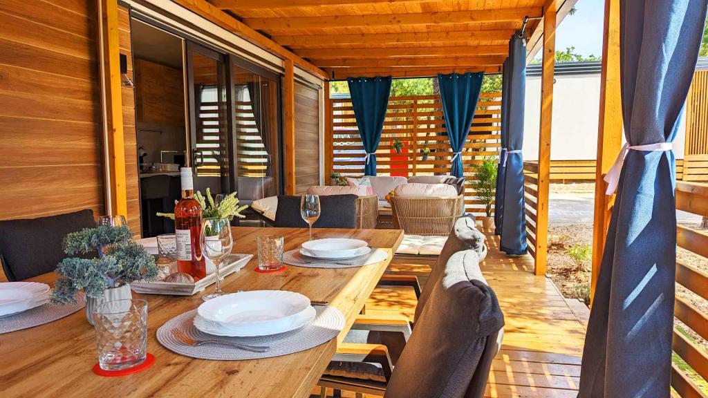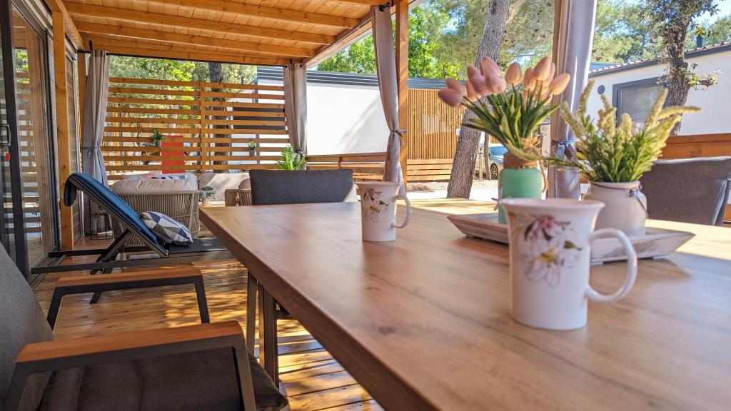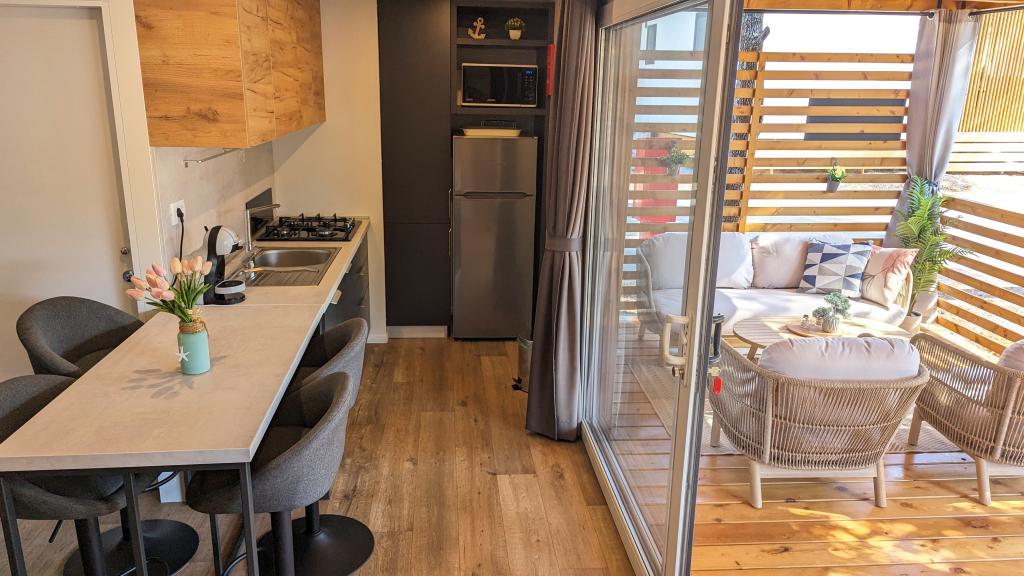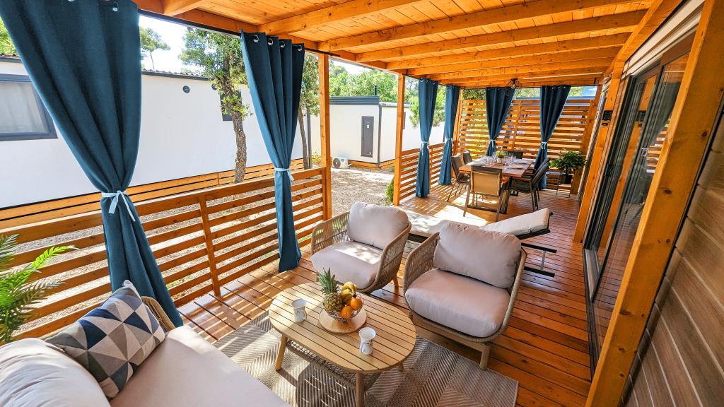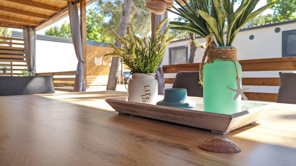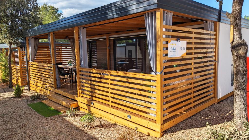 Profitez de la nature et du confort : les mobil-homes Jaki du camping Soline, à Biograd na Moru. Situés dans un coin tranquille de ce camping 4 étoiles, entourés de pinèdes, nos mobil-homes modernes sont parfaits pour accueillir jusqu'à 6 personnes. Appréciez la proximité de la plage (2 à 5 minutes à pied), des commerces et restaurants, et de la promenade menant au centre-ville (15 minutes). Ces mobil-homes offrent 2 chambres et 2 salles de bains, un salon, une grande terrasse avec table à manger et coin détente, ainsi qu'une cuisine entièrement équipée : lave-vaisselle, micro-ondes, cafetière, grille-pain, mixeur et barbecue. Le mobil-home comprend également le Wi-Fi gratuit, un parking gratuit juste à côté, une Smart TV, la climatisation, les serviettes et le linge de lit. Le camping propose de nombreuses activités pour toute la famille : de magnifiques plages de sable et de galets s'étendant jusqu'au centre-ville, un restaurant aux spécialités méditerranéennes, une aire de jeux pour enfants, des activités sportives et la location de vélos. Dalmaland, le plus grand parc aquatique à thème de Croatie, est à 15 minutes en voiture.