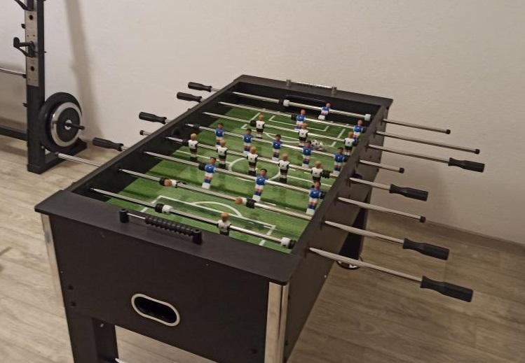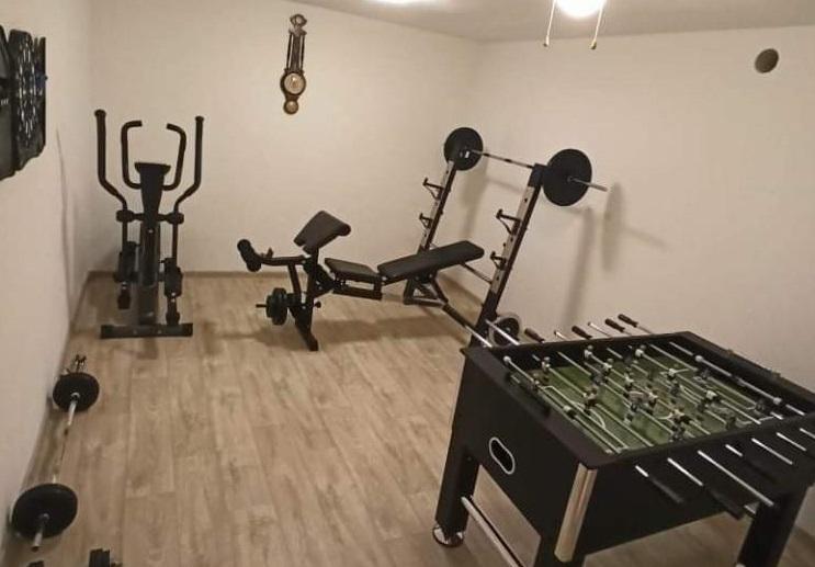 La salle de loisirs et de remise en forme au sous-sol, incluse dans le prix, est équipée d'appareils de musculation, d'un vélo elliptique, d'un baby-foot, de fléchettes et d'un vélo - idéale pour les loisirs et les moments de détente en famille.