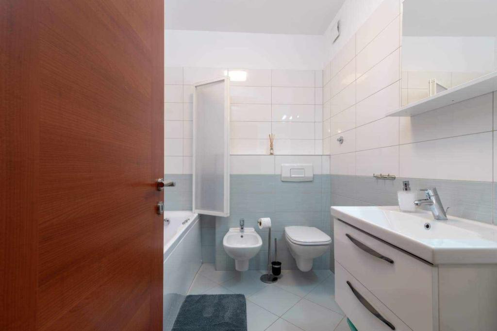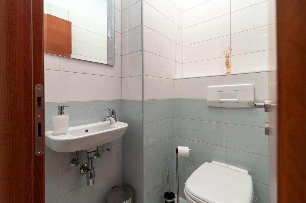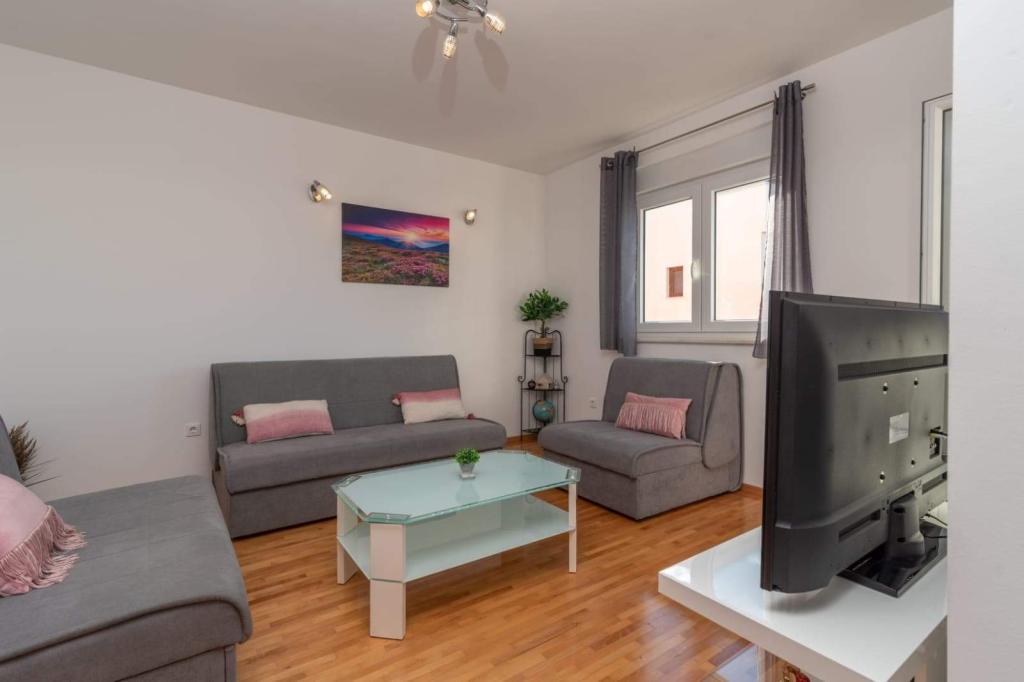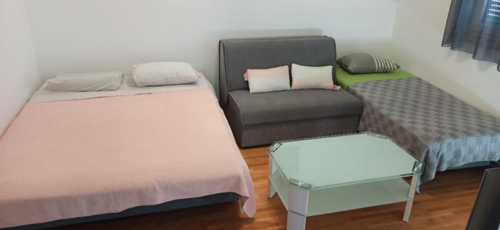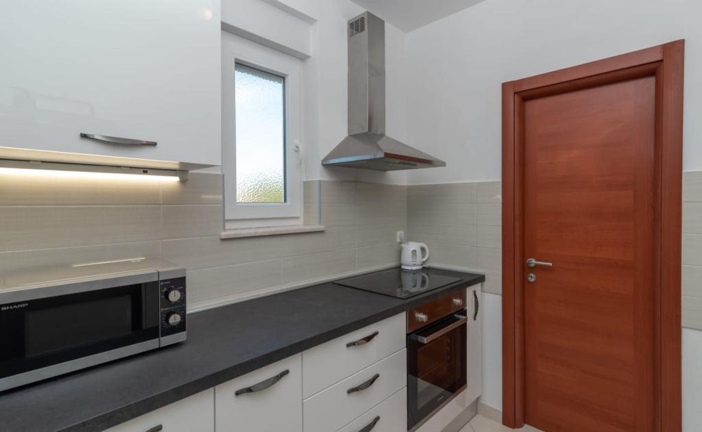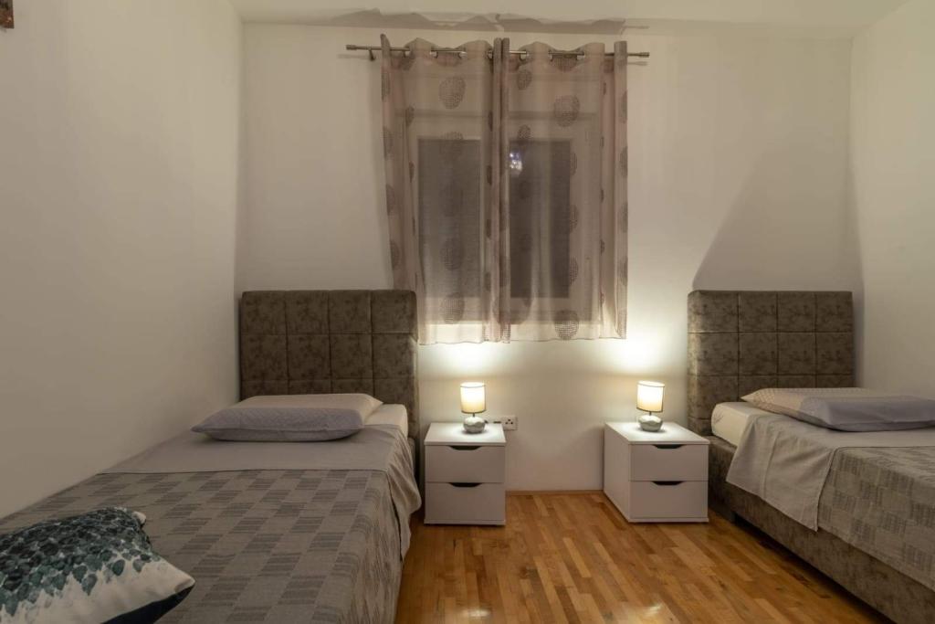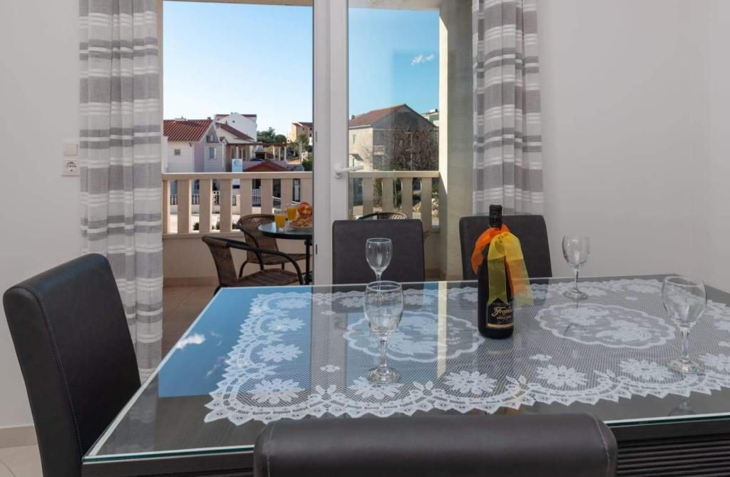 L'appartement est situé sur l'île de Čiovo, dans une baie paisible du district de Rastići, idéal pour des vacances en famille. Il se trouve à 200 m de plages rocheuses et à 400 m de plages de sable, tandis que la célèbre plage de Copacabana est à seulement 1,6 km. La ville de Trogir, classée au patrimoine mondial de l'UNESCO, est à quelques kilomètres. Situé au premier étage, l'appartement offre une superficie de 72,5 m² avec un balcon de 7 m² et peut accueillir jusqu'à 6 personnes (7 si nécessaire), avec un lit bébé. Vous profiterez de la climatisation, du Wi-Fi gratuit et d'une place de parking privée. L'appartement dispose également d'une salle de fitness et d'une salle de jeux au sous-sol, incluses dans le prix. Équipée d'appareils de musculation, d'un vélo elliptique, d'un baby-foot, de fléchettes et d'un vélo, elle est idéale pour se détendre et s'amuser en famille.