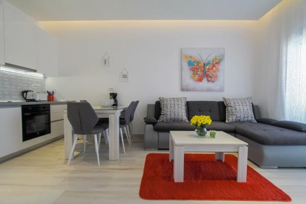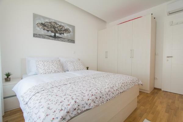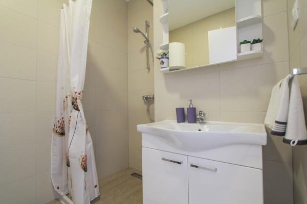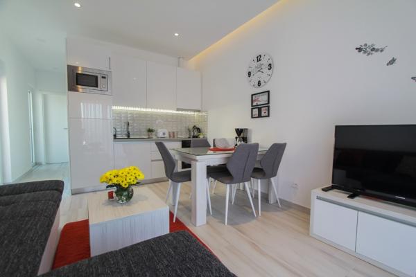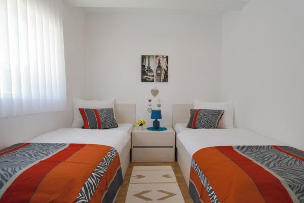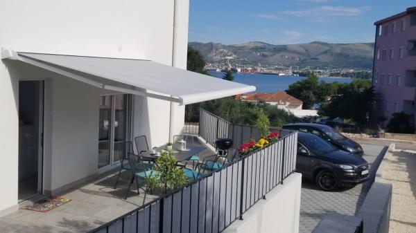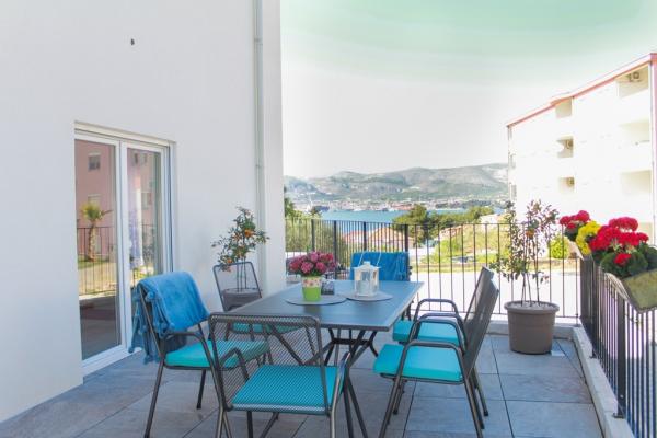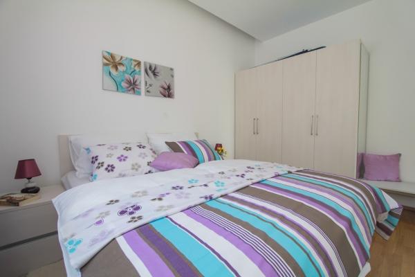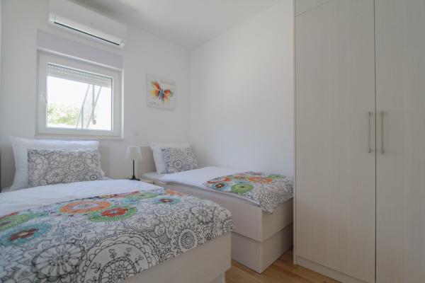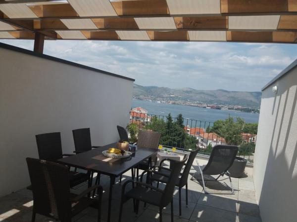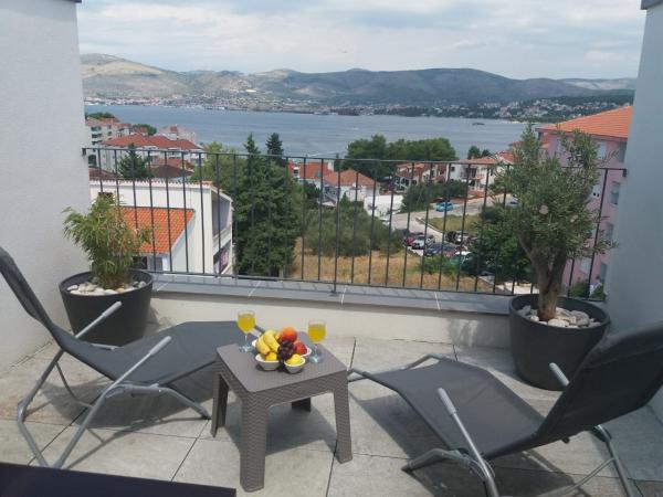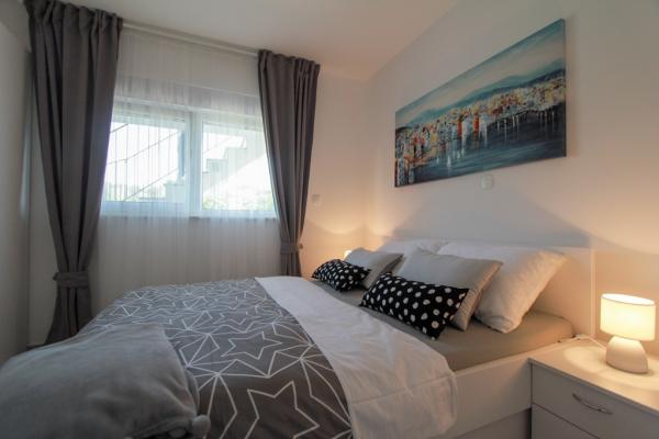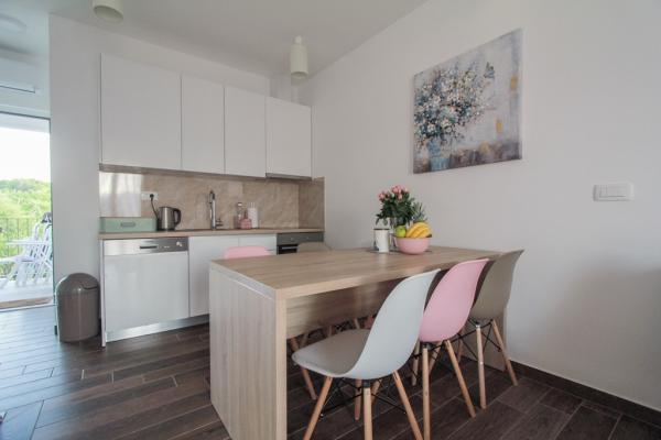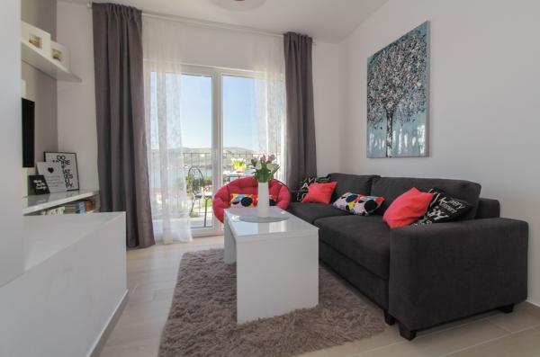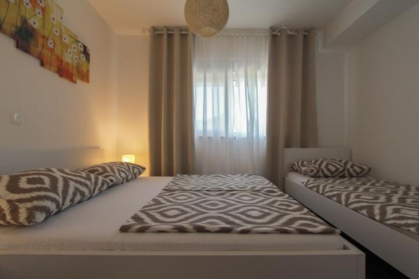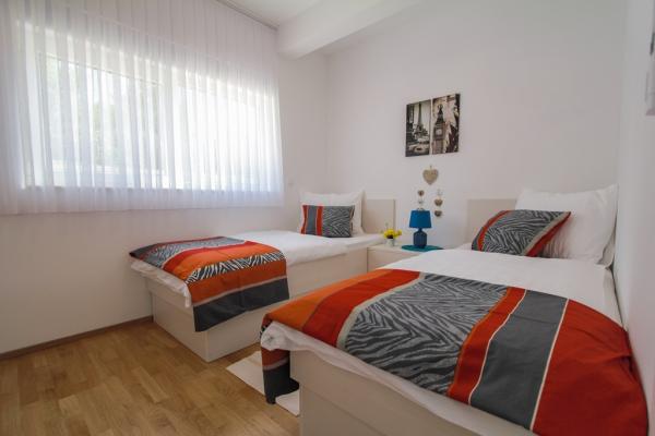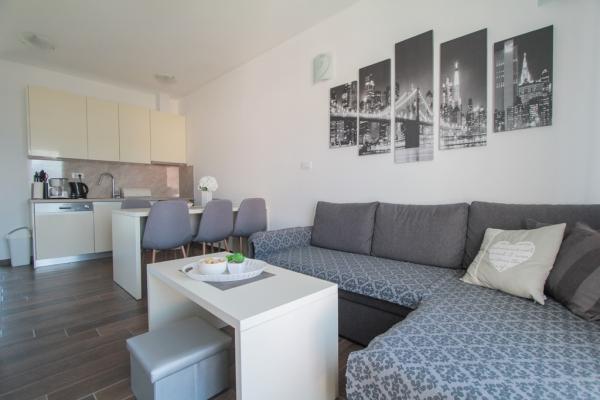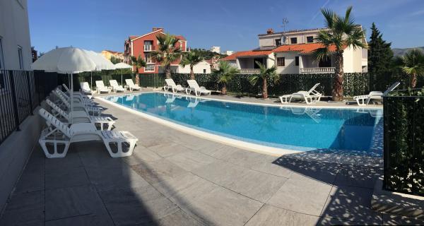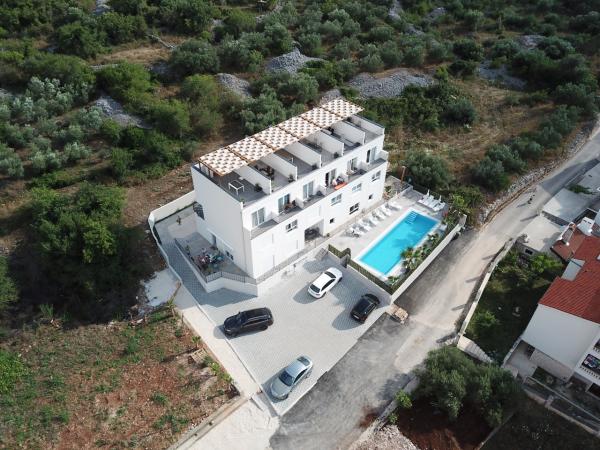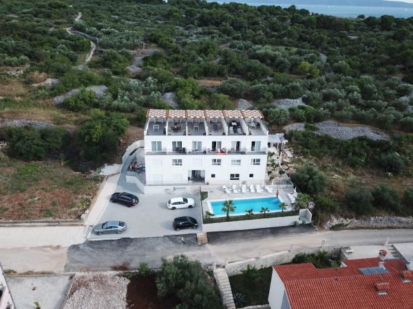 Les nouveaux appartements de deux chambres sont situés dans un quartier calme d'Okrug Gornji, à seulement 5 minutes à pied de la plage de la baie d'Okruška et à 10 minutes à pied de la plage de Tatinje. . Les appartements sont meublés de façon moderne et comprennent une cuisine entièrement équipée. Les suites sur six étages ont chacune leur propre terrasse sur le toit de 25 m2 avec une vue magnifique sur la mer. Il y a un barbecue et un ensemble de sièges. Deux appartements situés au rez-de-chaussée possèdent également une terrasse avec vue sur la mer, un barbecue et des sièges. En face de l'immeuble se trouve une piscine d'eau salée de 50 m2. En mai et octobre, l'eau de la piscine sera chauffée. Beplatan wifi. Dans la cour de l'immeuble, il y a une place de parking pour chaque appartement.