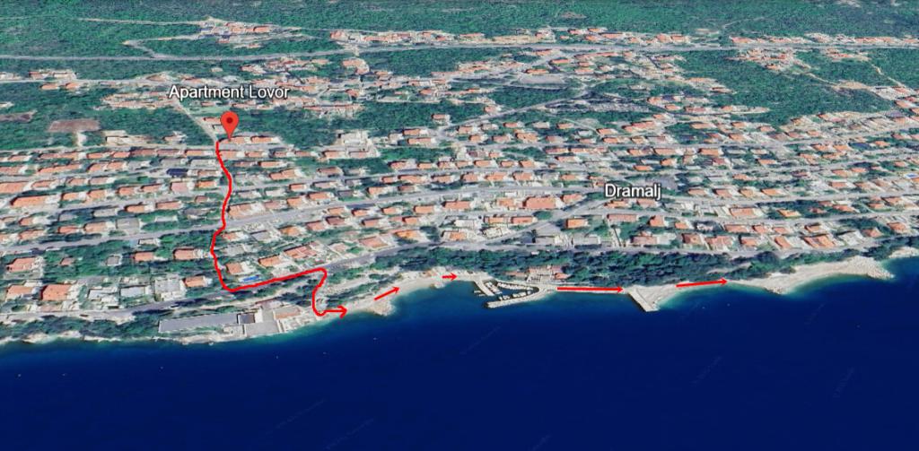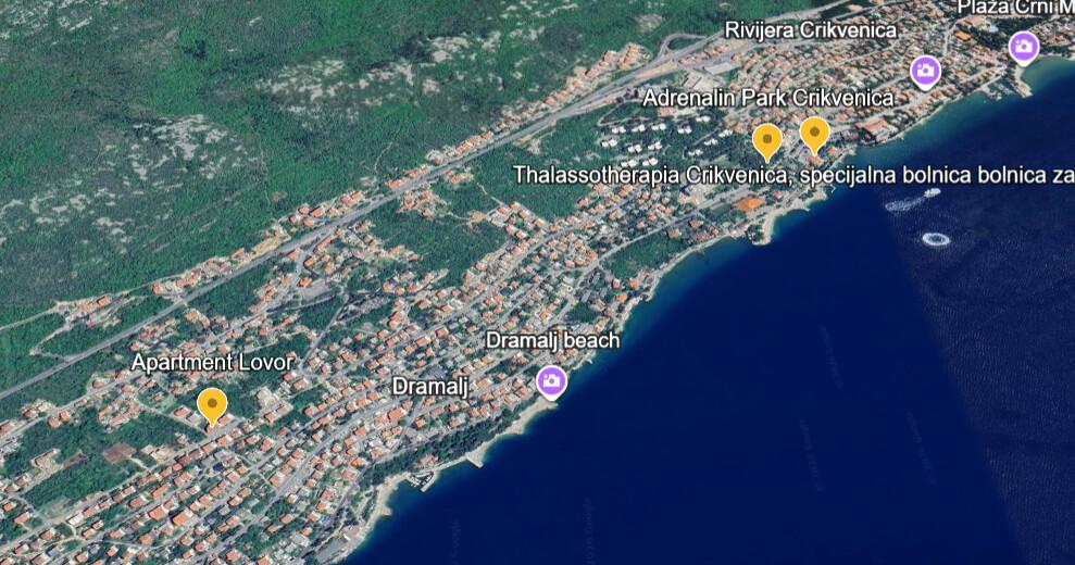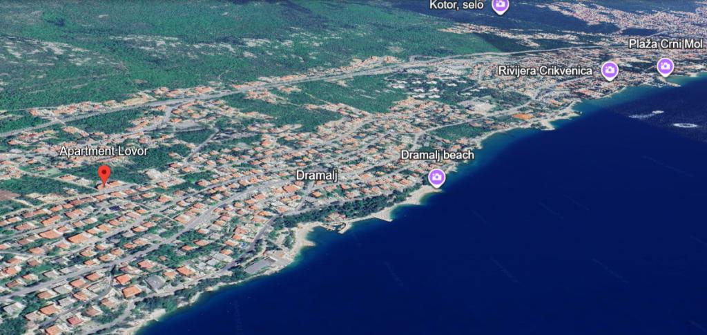 Appartement Lovor (31m²), RDC d'un immeuble résidentiel, calme à Dramalj. 450m de la mer, proche Thalassotherapia, parc Adrénaline et sentiers. Idéal pour 2-3 adultes ou famille. Comprend chambre (160x200), salle de bain, terrasse et cuisine équipée (frigo, cuisinière, micro-ondes, bouilloire, machine à café, grille-pain, vaisselle) avec séjour (TV, canapé-lit 75x200/150x200). Clim, Wi-Fi gratuit et parking privé.