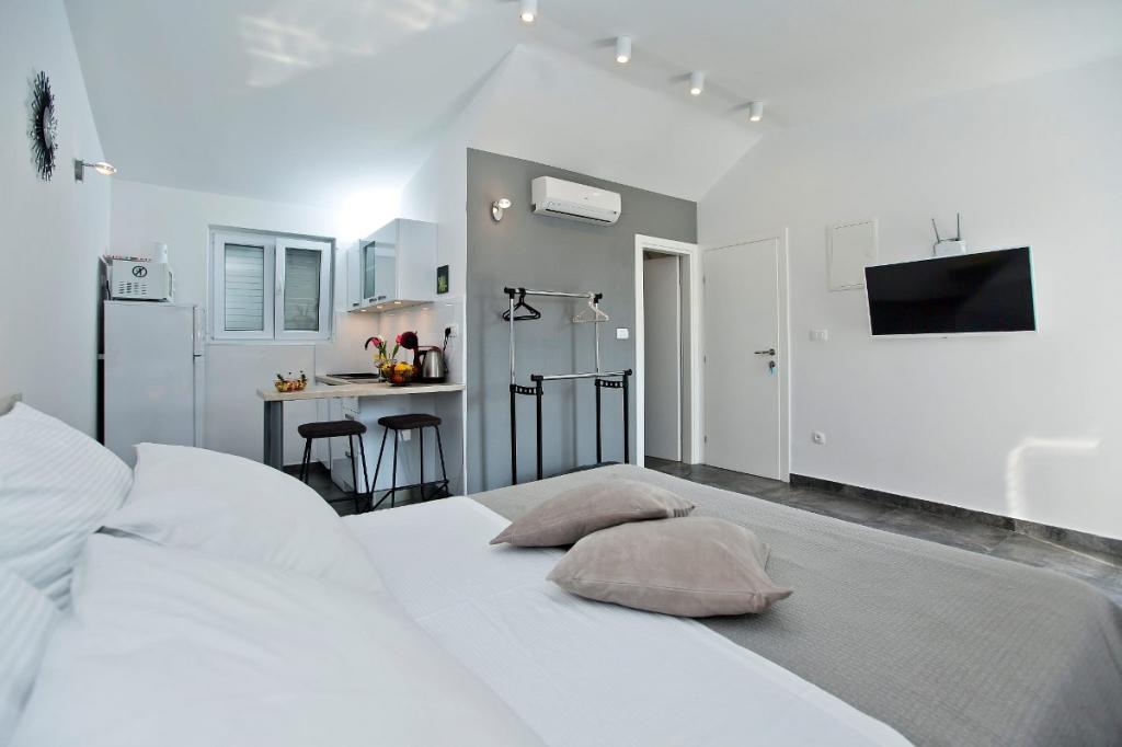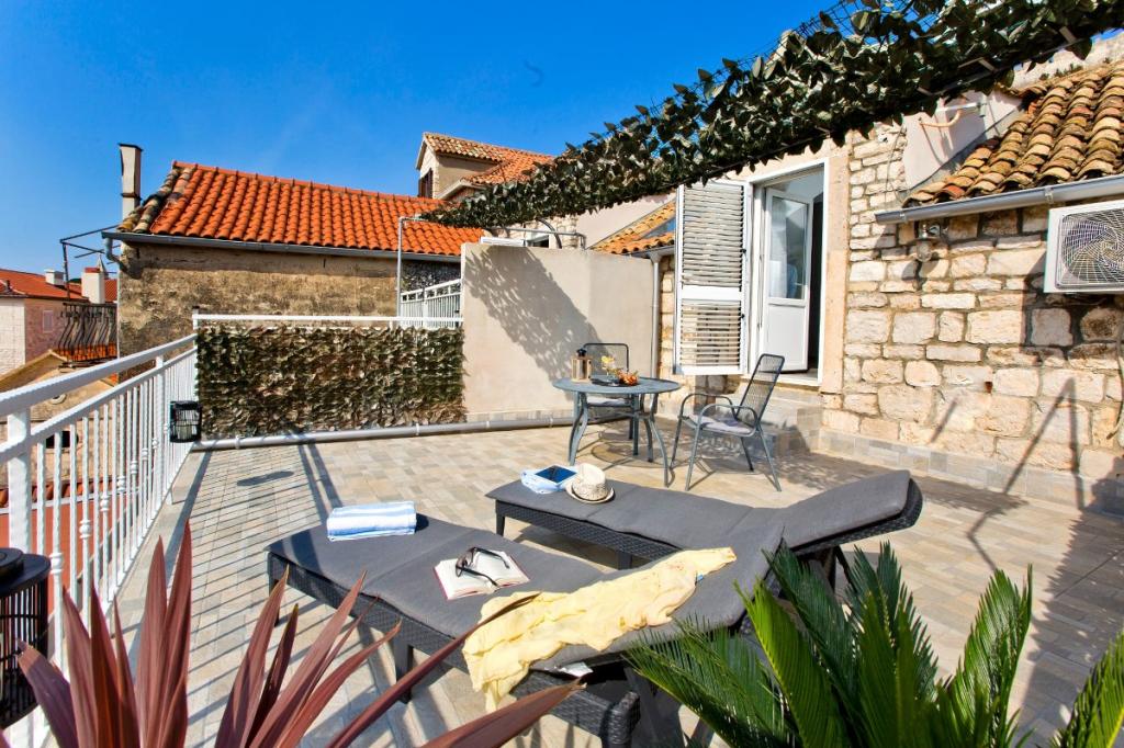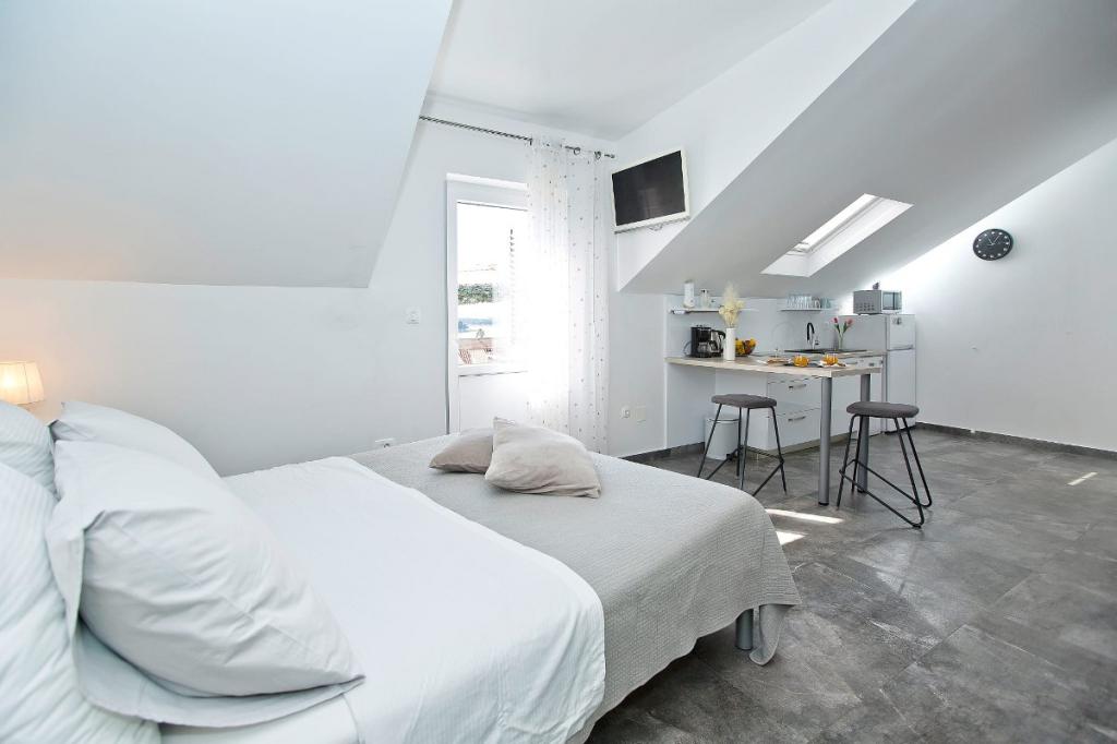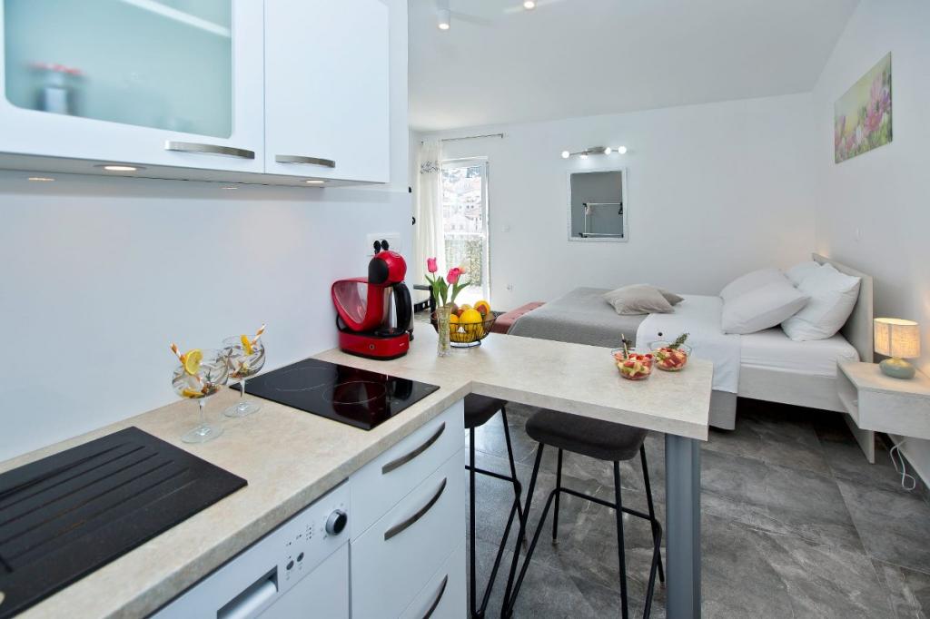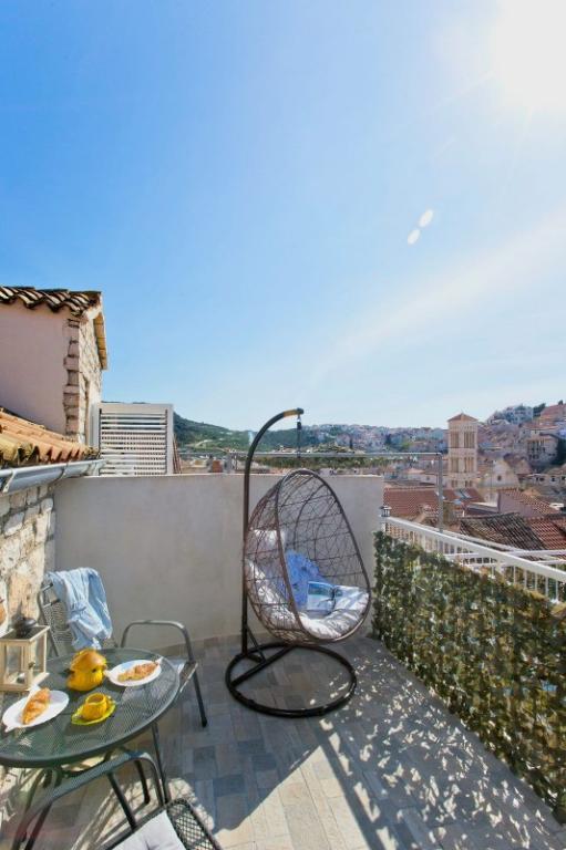Élégamment décorés et situés en plein cœur de Hvar, ces studios offrent un parfait équilibre entre confort et emplacement idéal. Lumineux et modernes, ils sont équipés d'un lit double confortable (160 x 200 cm), d'une cuisine entièrement équipée avec tous les équipements nécessaires (réfrigérateur-congélateur, bouilloire, grille-pain, plaques de cuisson, micro-ondes, lave-vaisselle), d'une salle de bain avec douche à l'italienne, de la climatisation et d'une terrasse privative (table, chaises et transats) offrant une vue imprenable sur la vieille ville et le magnifique port de Hvar. Profitez pleinement de Hvar à deux pas de votre studio : charmants cafés, restaurants de qualité, adresses conviviales pour le petit-déjeuner, boutiques locales et magasins de souvenirs. La place principale, avec la cathédrale Saint-Étienne et le plus ancien théâtre public d'Europe, est à seulement 3 minutes à pied. Vous séjournerez en plein centre de Hvar, dans une rue calme et paisible, vous garantissant des nuits reposantes.