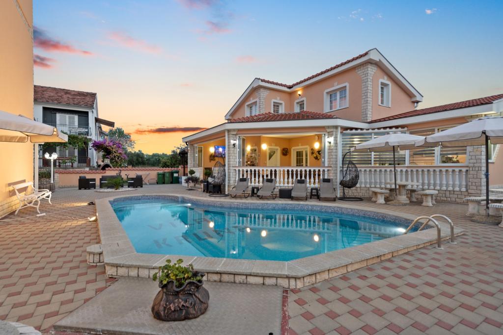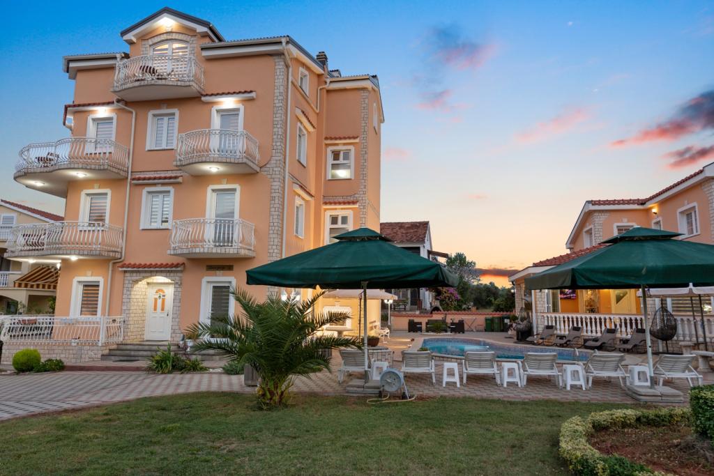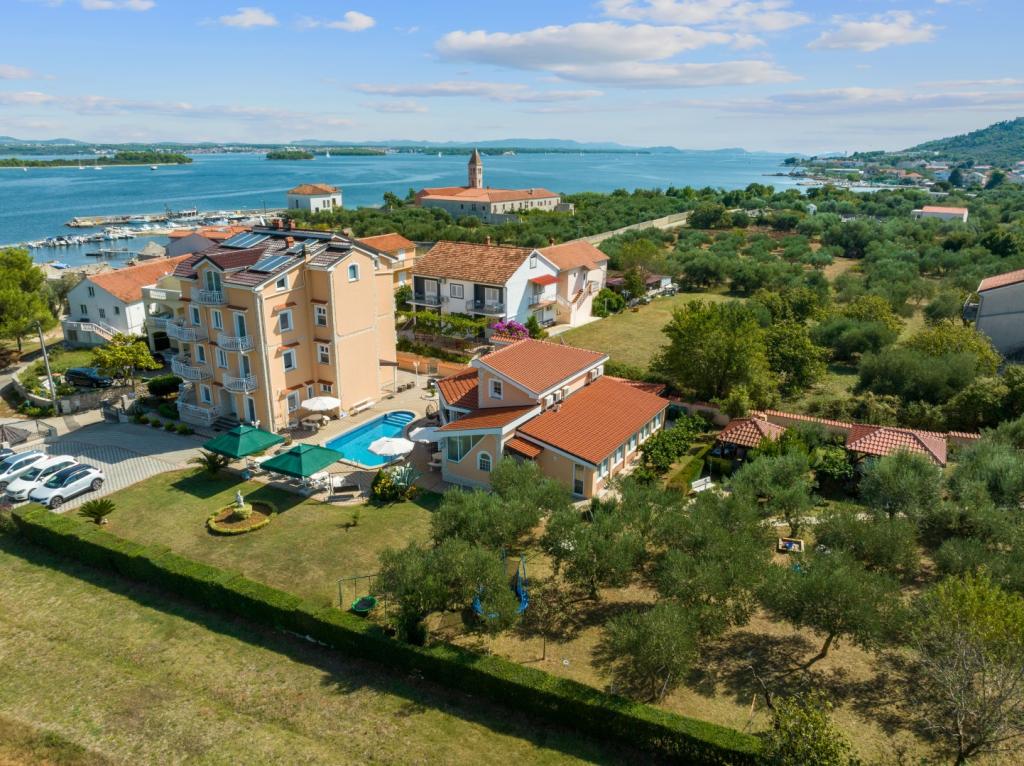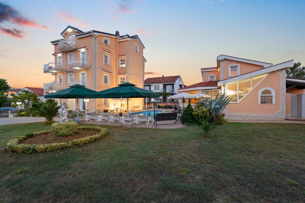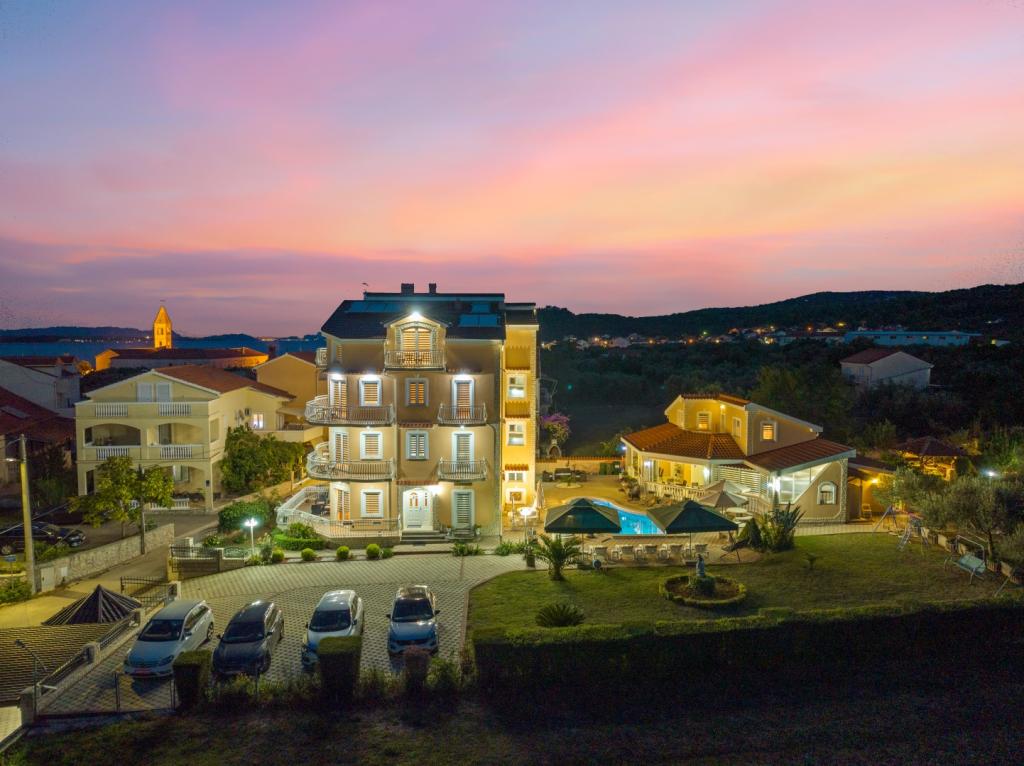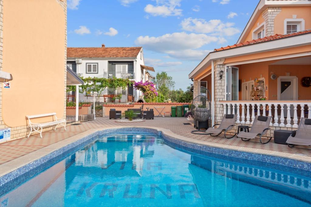 Crown Villa est un luxueux hôtel 4 étoiles qui peut accueillir 30 personnes. Villa est le premier d'une série, situé dans un bel emplacement sur la plage de sable fin avec une vue sur le canal de Pasman. Jardin avec une riche végétation méditerranéenne qui entoure la villa et le rend particulièrement attrayant. Dans le jardin il ya une piscine chauffée avec éclairage. La villa dispose de 7 suites spacieuses, chacune décorée d'une manière spéciale. Chaque appartement possède un balcon ou d'une terrasse donnant sur la mer, plage et jardin villas.