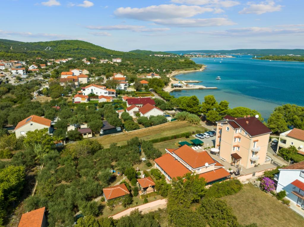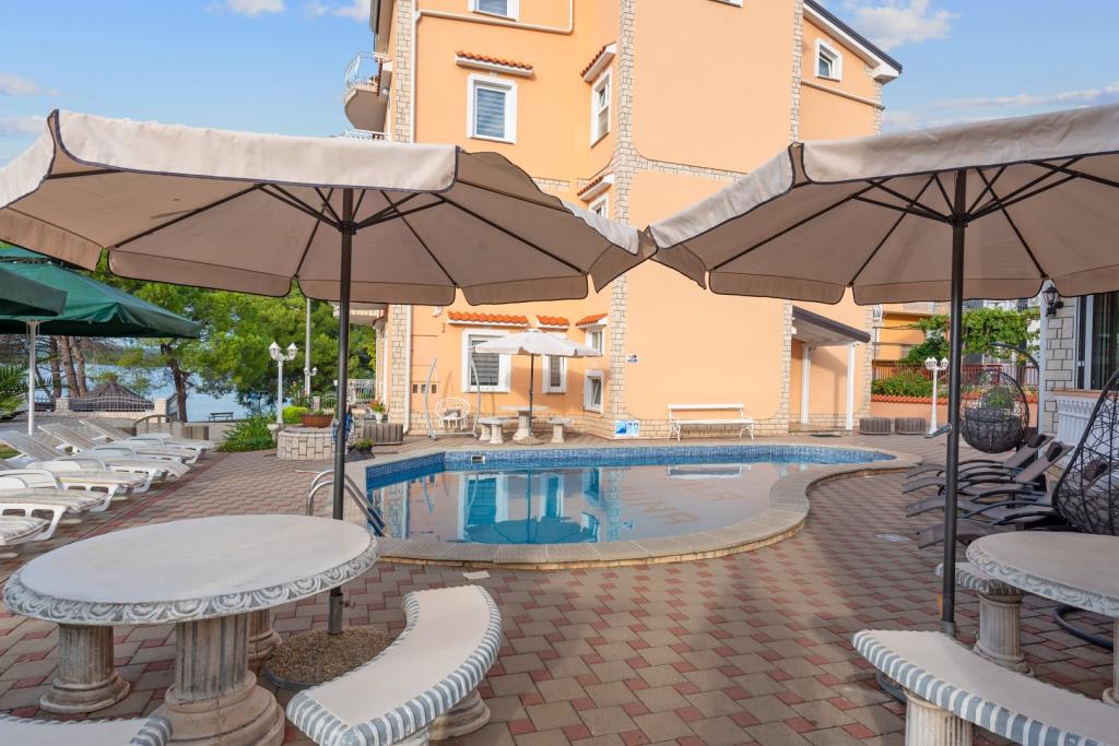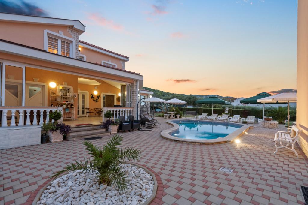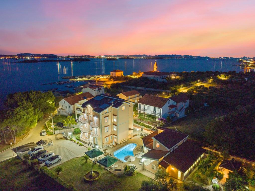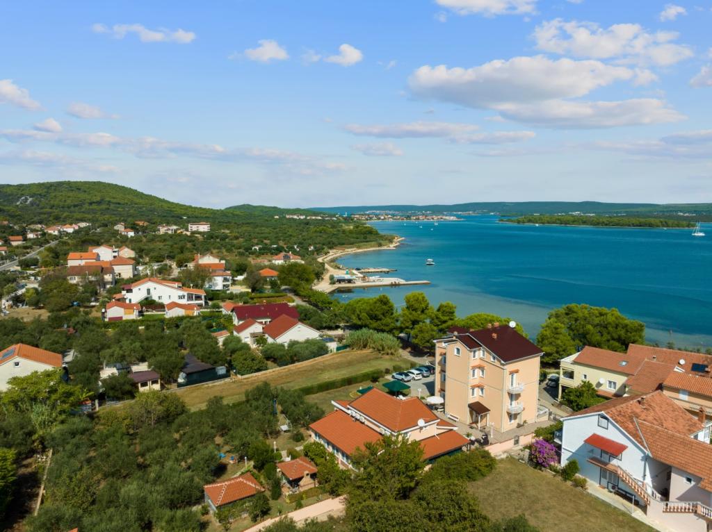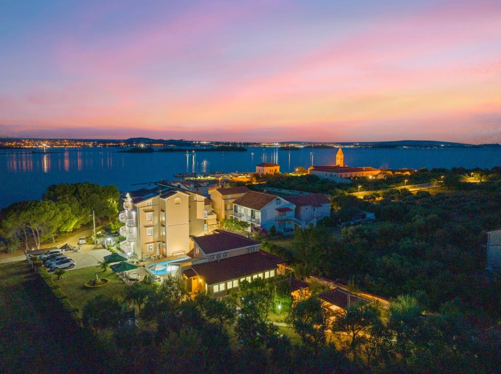 Crown Villa est un luxueux hôtel 4 étoiles qui peut accueillir 30 personnes. Villa est le premier d'une série, situé dans un bel emplacement sur la plage de sable fin avec une vue sur le canal de Pasman. Jardin avec une riche végétation méditerranéenne qui entoure la villa et le rend particulièrement attrayant. Dans le jardin il ya une piscine chauffée avec éclairage. La villa dispose de 7 suites spacieuses, chacune décorée d'une manière spéciale. Chaque appartement possède un balcon ou d'une terrasse donnant sur la mer, plage et jardin villas.