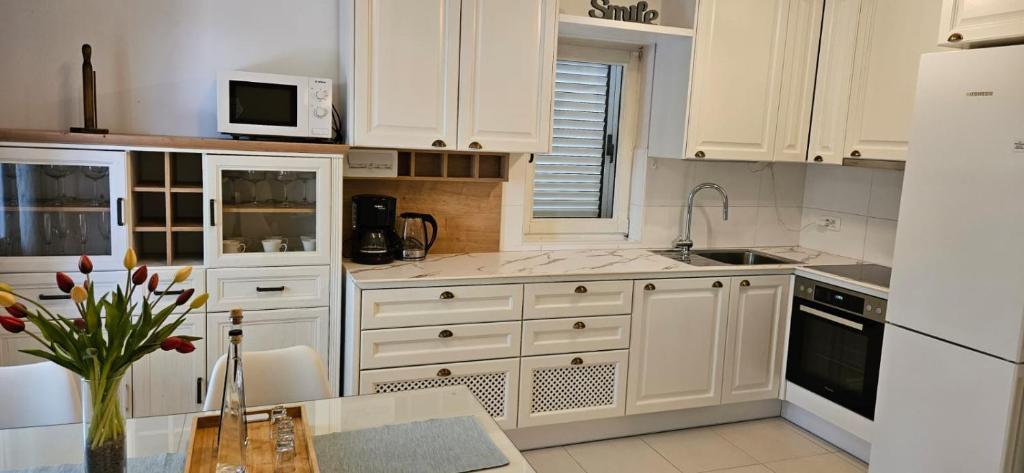 La Villa Branka est une charmante maison composée de cinq logements indépendants, idéale pour des vacances reposantes en pleine nature. Entourée de verdure et bénéficiant d'un emplacement exceptionnel, elle offre une vue imprenable sur la mer Adriatique d'un côté et sur le majestueux massif du Biokovo de l'autre. Située dans un quartier exceptionnellement calme de la Riviera de Makarska, sur une douce colline, à l'écart de l'agitation touristique et du bruit, elle est parfaite pour une détente absolue et une intimité totale. La villa se trouve à seulement 2 minutes en voiture de la plage et à 5 minutes du centre de Makarska, une ville touristique pittoresque proposant de nombreux services, restaurants et de superbes plages. L'alliance parfaite entre calme, nature et proximité des commodités essentielles.