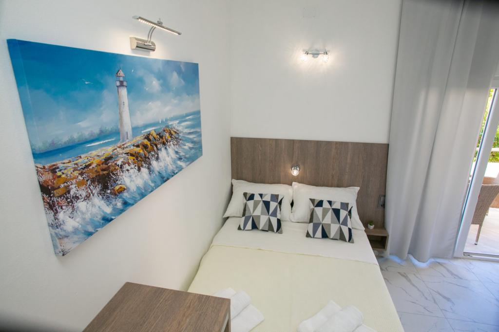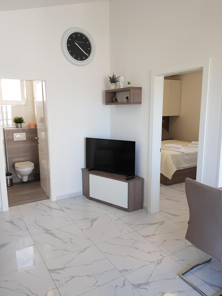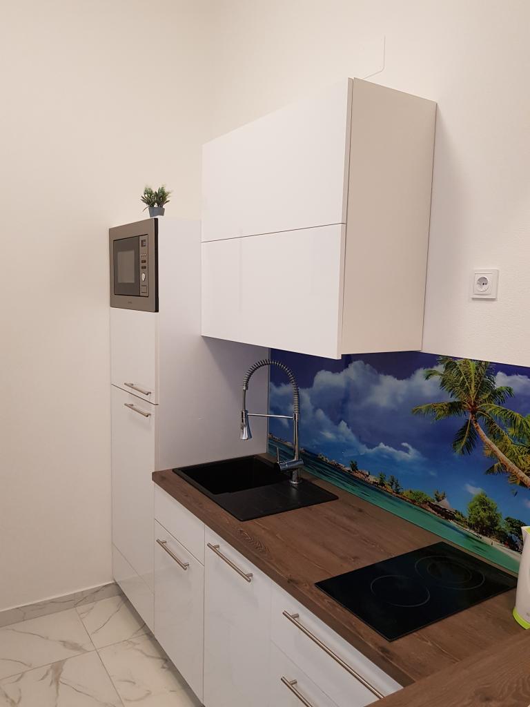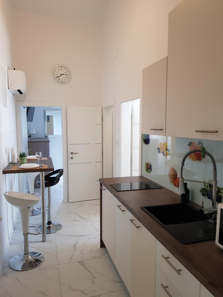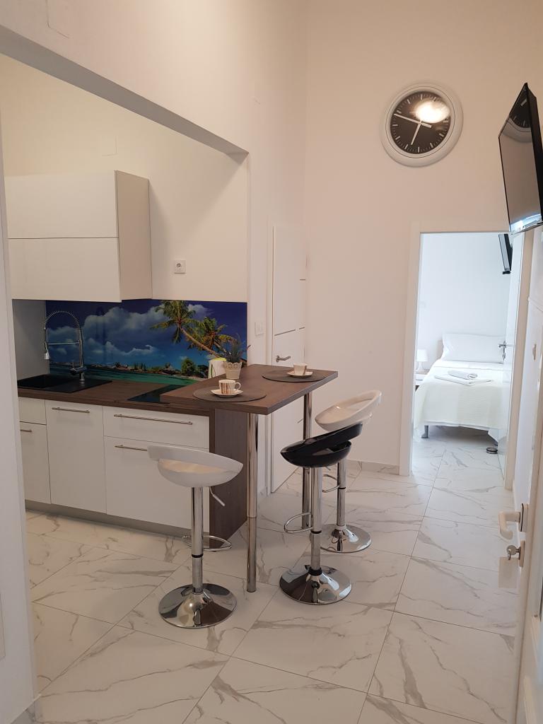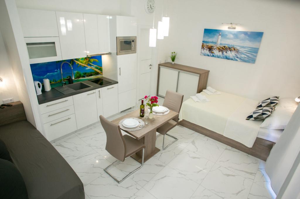 Appartements modernes entièrement équipés avec cuisine équipée, bouilloire, grille-pain, micro-ondes, cafetière, fer à repasser, coffre-fort et sèche-cheveux.