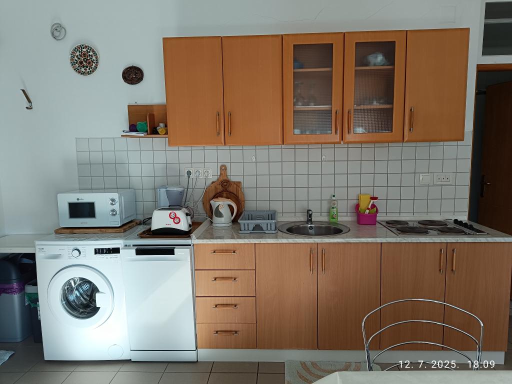 Deux grands appartements de deux chambres (60 m²) se trouvent au deuxième étage de la maison et offrent une magnifique vue sur la mer. Un appartement plus petit d'une chambre (45 m²) est situé dans une maison en pierre indépendante (de style rustique) attenante à la maison principale, avec laquelle il partage un jardin et une cour. Le parking est gratuit. Un barbecue avec terrasse est à la disposition de tous les hôtes. La mer se trouve à environ 250 m en contrebas, où l'on trouve une promenade bordée de restaurants et de plages variées. Le centre-ville est à environ 1,5 km en suivant la promenade du bord de mer.