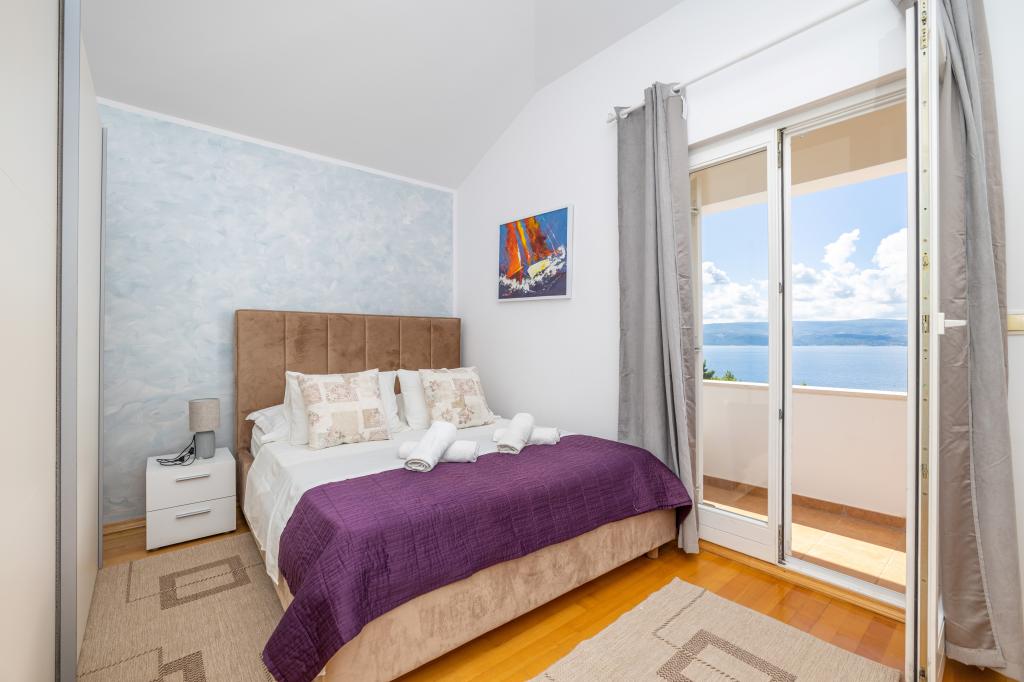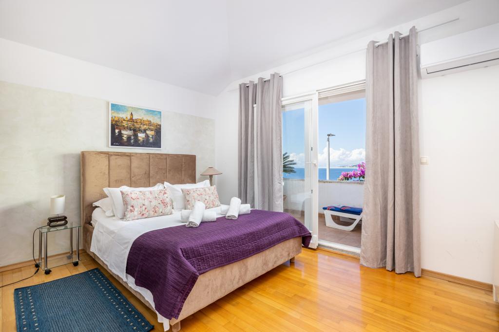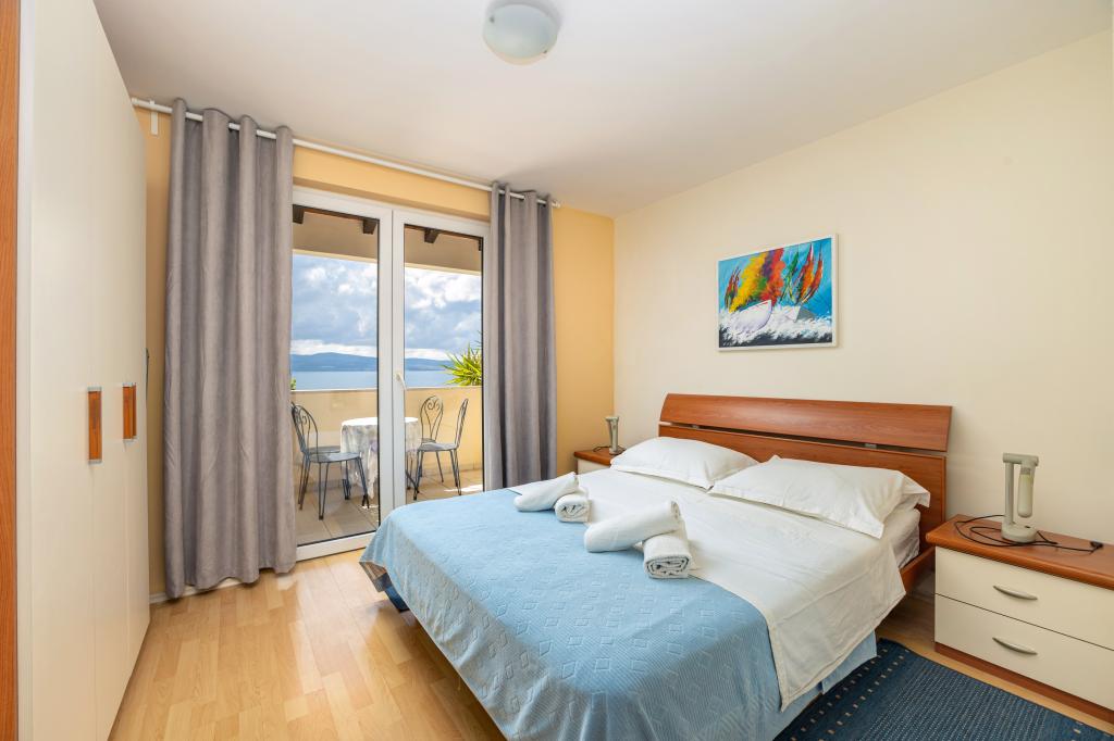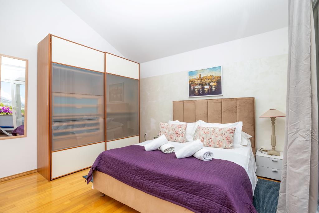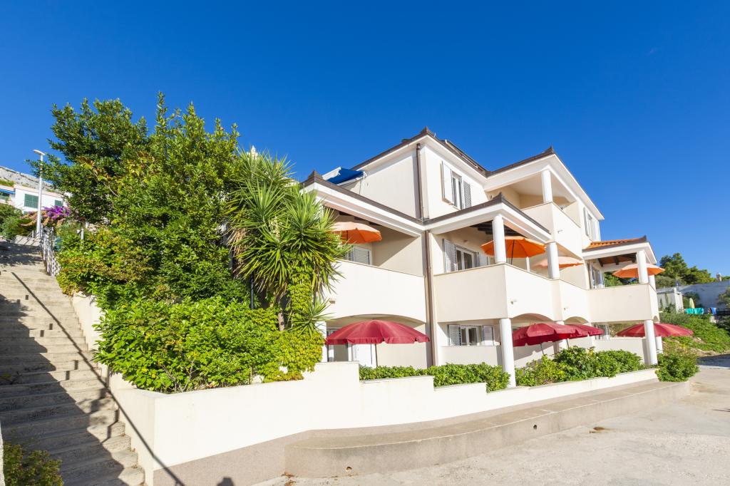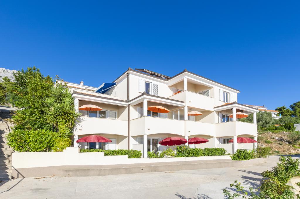 Hébergement dans des appartements neufs, extrêmement confortables et parfaitement équipés. La résidence est située à 3 km du centre d'Omiš. Huit appartements sont situés en première ligne de mer. Tous disposent de grandes terrasses avec vue sur la mer et l'île de Brač. Des places de parking sont disponibles juste à côté de la villa. Les appartements sont situés en contrebas de la route principale (300 mètres), juste à côté de la mer et d'une grande plage de galets. Quatre types d'appartements sont proposés : les 2+2 avec une chambre double séparée et un salon avec deux lits, les 2+2 avec un grand studio, les grands appartements de luxe, les 4+2 avec deux chambres doubles et un grand salon avec deux lits gigognes et les grands appartements de luxe. Appartement de type 14+2, en réalité une villa sur trois étages de 300 m², avec piscine chauffée de 9 x 4 mètres, sept chambres doubles, deux grands salons avec balcons et terrasses, quatre salles de bains, des toilettes séparées, un barbecue extérieur, un sauna et une salle de sport. La piscine est réservée à l'appartement A 14+2. Les autres appartements ne le sont pas.