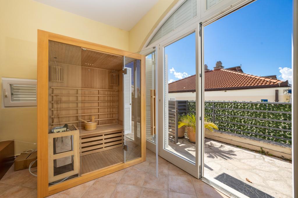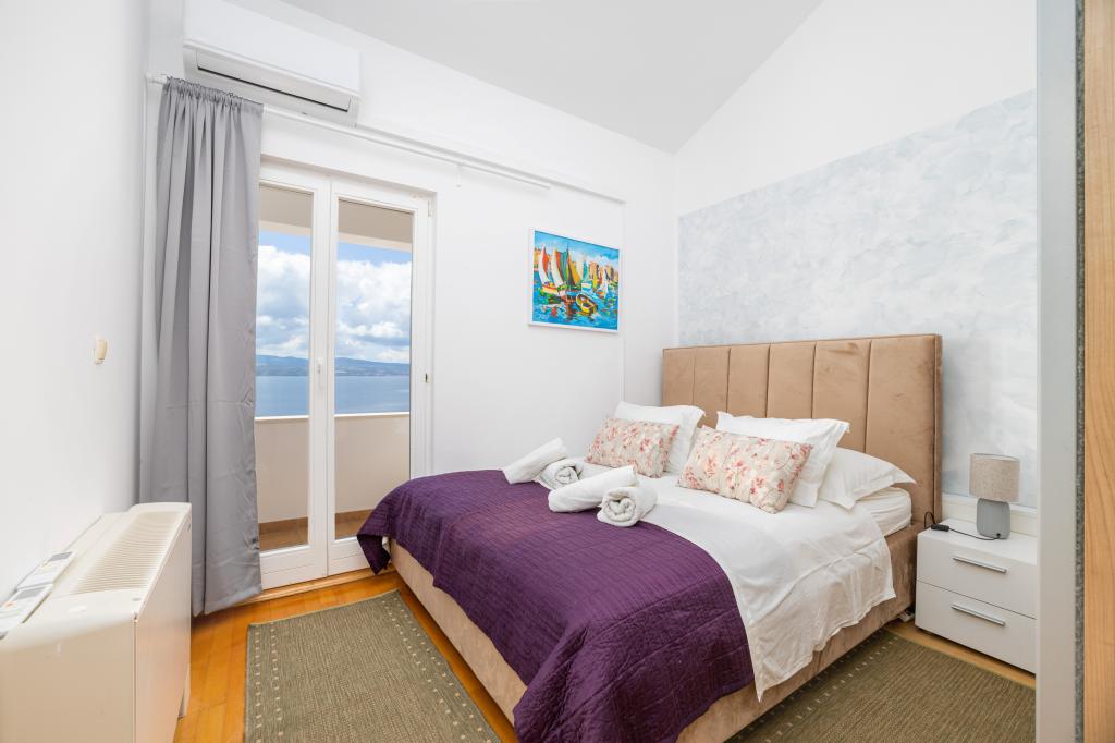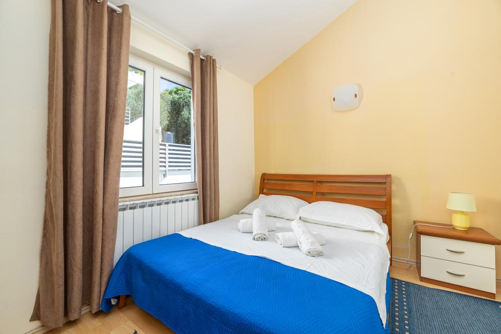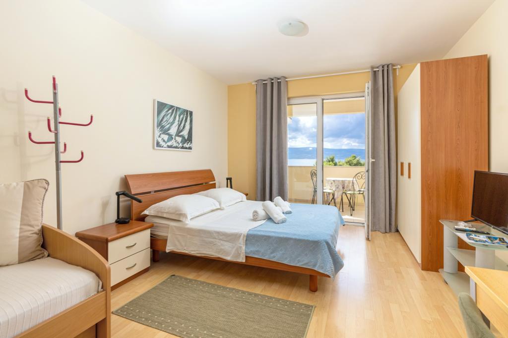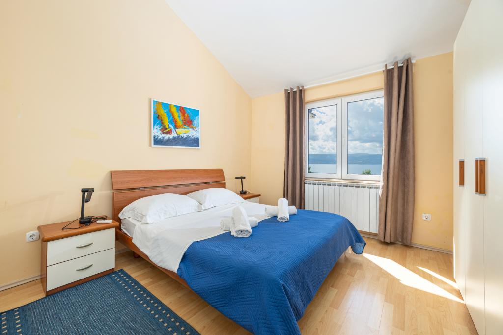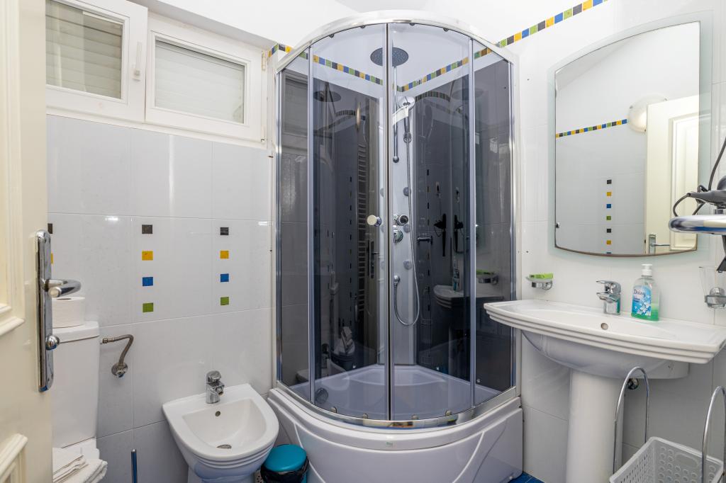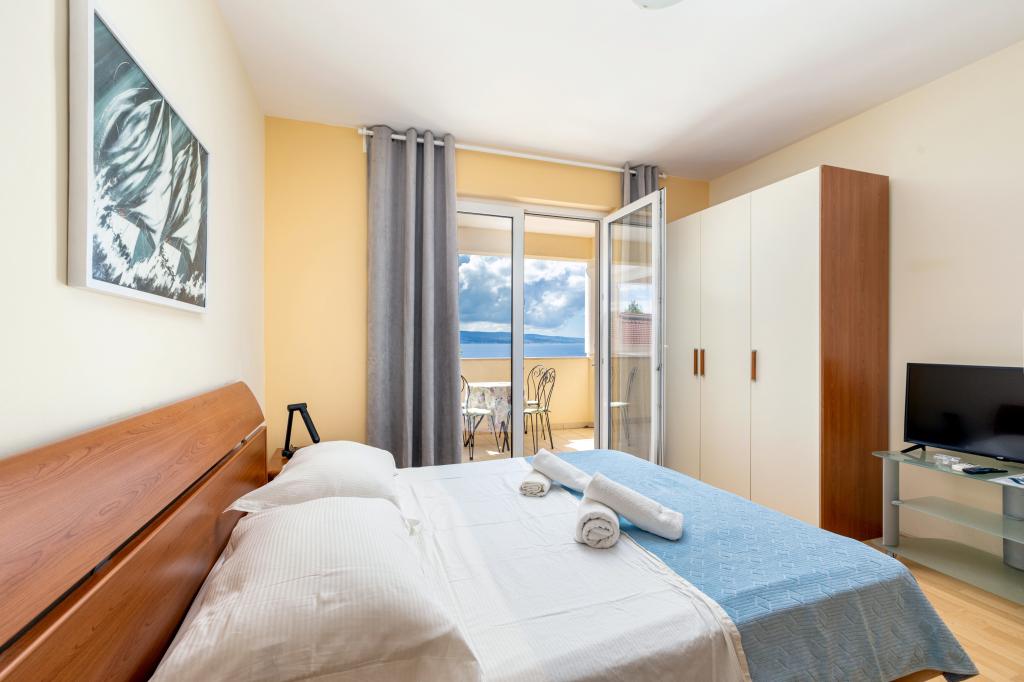 Hébergement dans des appartements neufs, extrêmement confortables et parfaitement équipés. La résidence est située à 3 km du centre d'Omiš. Huit appartements sont situés en première ligne de mer. Tous disposent de grandes terrasses avec vue sur la mer et l'île de Brač. Des places de parking sont disponibles juste à côté de la villa. Les appartements sont situés en contrebas de la route principale (300 mètres), juste à côté de la mer et d'une grande plage de galets. Quatre types d'appartements sont proposés : les 2+2 avec une chambre double séparée et un salon avec deux lits, les 2+2 avec un grand studio, les grands appartements de luxe, les 4+2 avec deux chambres doubles et un grand salon avec deux lits gigognes et les grands appartements de luxe. Appartement de type 14+2, en réalité une villa sur trois étages de 300 m², avec piscine chauffée de 9 x 4 mètres, sept chambres doubles, deux grands salons avec balcons et terrasses, quatre salles de bains, des toilettes séparées, un barbecue extérieur, un sauna et une salle de sport. La piscine est réservée à l'appartement A 14+2. Les autres appartements ne le sont pas.
