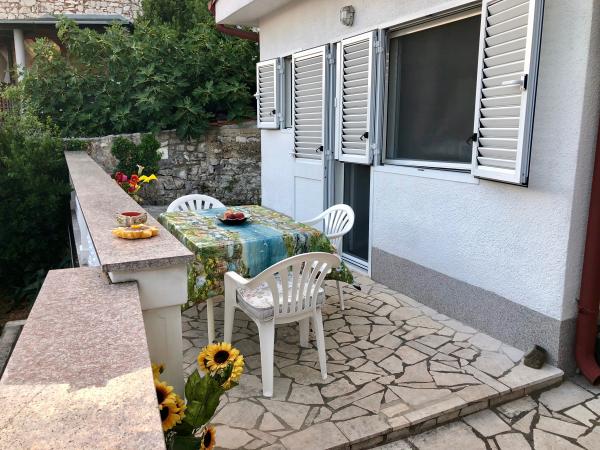 Complètement et modernement équipé (appartement) appartement dans une cour avec terrasse, à 200 mètres du centre de Selce, la plage et le contenu le plus important. Vous avez votre propre entrée et votre terrasse. L'espace de stationnement est sur la route en face de la maison mais nous ne pouvons pas le garantir si vous voulez utiliser la voiture tous les jours.
