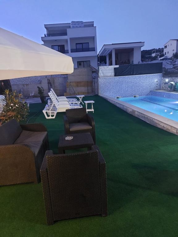 appartements confortables, belle vue depuis la terrasse, sous la forme d'un pool de bonus dans le jardin, bien équipées plage privée, bar et reštika trois minutes de la plage ...