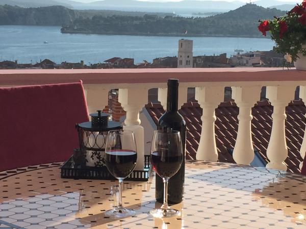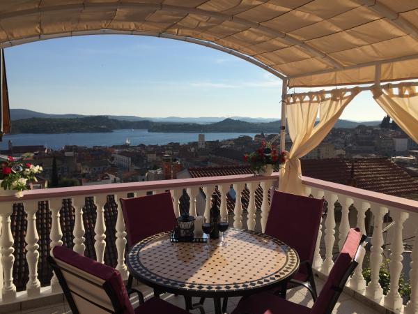 Appartement Santina se trouve à Sibenik, directement sous la Barone forteresse, se trouve à 5 minutes à pied de la cathédrale. James et à 15 minutes à pied de la plage. Les suites offrent une belle vue panoramique sur la ville, les îles voisines et la forteresse. De la terrasse, vous pouvez voir tous les endroits où il a filmé une série de jeux très populaires de Thrones. Cet appartement moderne est entièrement rénové récemment et est situé dans une villa moderne du 19ème siècle. L'appartement est climatisé, dispose d'une cuisine moderne, TV écran plat, Internet, Wi-Fi, des chaînes par satellite, serviettes et linge de maison. Un parking gratuit est situé à proximité de l'appartement. Nous offrons le transport de -up à la gare routière ou ferroviaire à l'appartement. Venez voir la beauté de Sibenik et tombe amoureux d'une belle vue depuis notre terrasse.