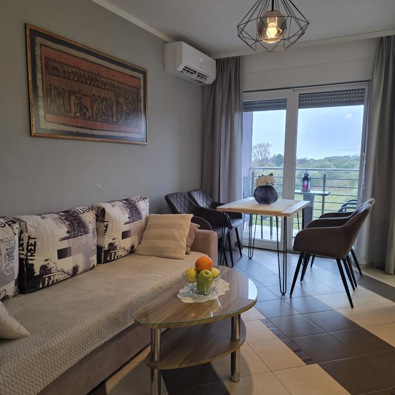 Les appartements Mirella 4 sont situés dans la résidence Lavande nouvellement construite avec vue sur la mer et une belle vue sur le coucher du soleil. Pour la mer et la belle plage de sable est à seulement 150m. Commerces, boulangerie et restaurants à 200m. Au centre d'Umag à 3 km. Le long de la mer, il y a une promenade jusqu'au centre d'Umag et la possibilité est le transport en train touristique. Les appartements sont climatisés et entièrement équipés avec tous les appareils. Salle de bain avec douche massante, lave-linge, sèche-cheveux, fer à repasser. Cuisine avec lave-vaisselle, micro-ondes, cafetière, bouilloire, grand réfrigérateur avec congélateur et tout le reste pour que les clients se sentent chez eux. Une connexion Internet et un parking sécurisé sont disponibles gratuitement. Le prix comprend l'utilisation de la piscine, des transats, de la douche, des deux places, de la table et des chaises dans la partie couverte de la terrasse au bord de la piscine. Merci d'avoir choisi Apartments Mirella, j'espère qu'en retour nous satisferons vos souhaits pendant votre séjour dans nos appartements. Notre objectif est votre satisfaction et votre recommandation. Chers clients, bienvenue aux appartements Mirella!