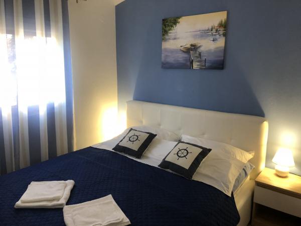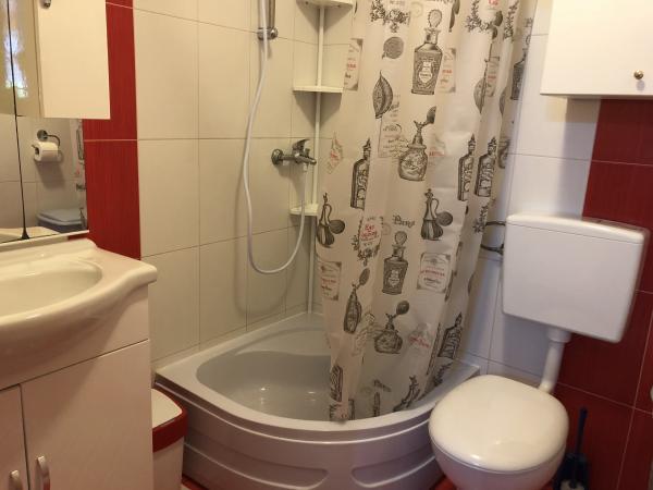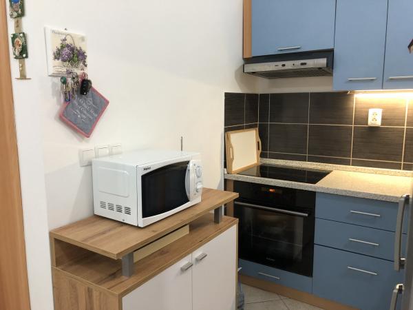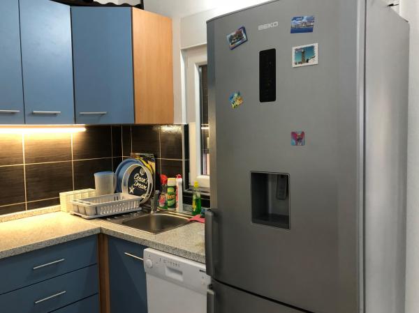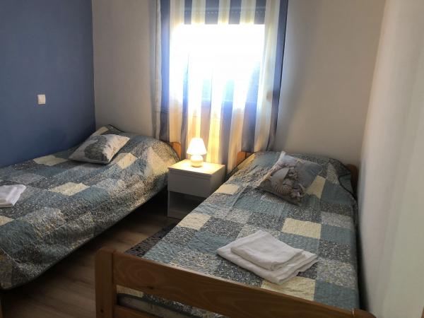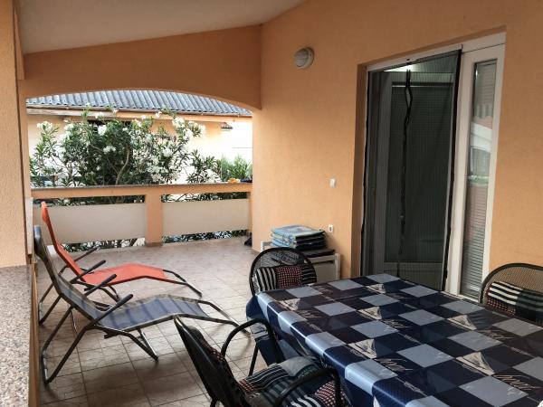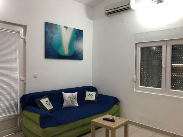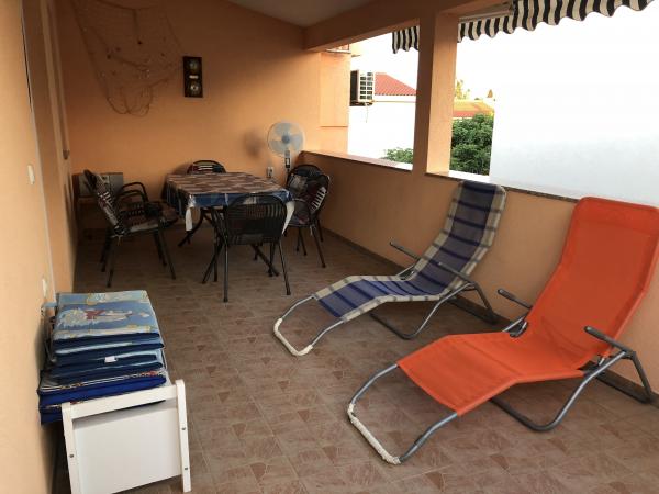Appartement équipé de façon moderne à 200 m de la plage et situé dans la première partie de l'île. L'appartement (60 m2) est situé au premier étage et se compose de deux chambres (un lit double et deux lits séparés). Séjour spacieux avec cuisine, salle de bain, TV écran plat et internet WiFi. La cuisine est équipée d'un lave-vaisselle, d'un four micro-ondes, d'un grand réfrigérateur, d'une bouilloire, d'un four et d'une plaque de cuisson. La terrasse spacieuse (15 m2) a un auvent et est couverte ; sur la terrasse il y a des transats et une table spacieuse pour 6 personnes. Au sein de l'appartement, il est possible d'utiliser un barbecue commun et une machine à laver. L'eau de l'appartement est potable (provenant du réseau d'eau de la ville). Un parking est prévu à l'intérieur du bâtiment. Il est permis de fumer uniquement sur la terrasse.