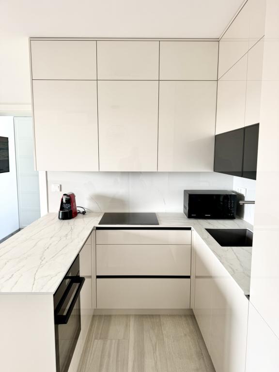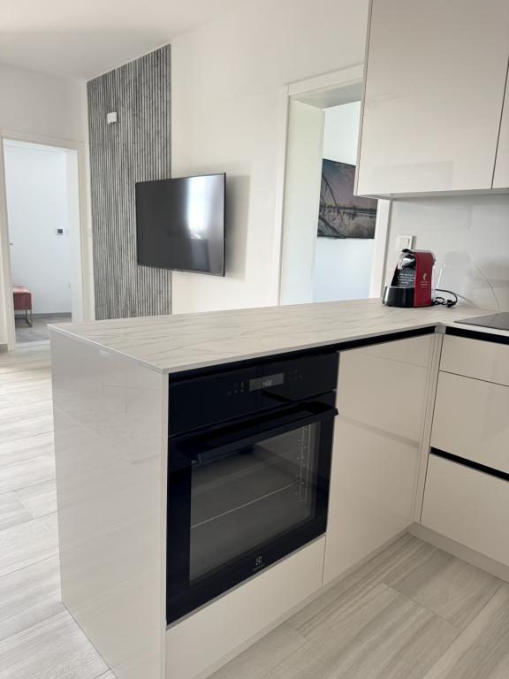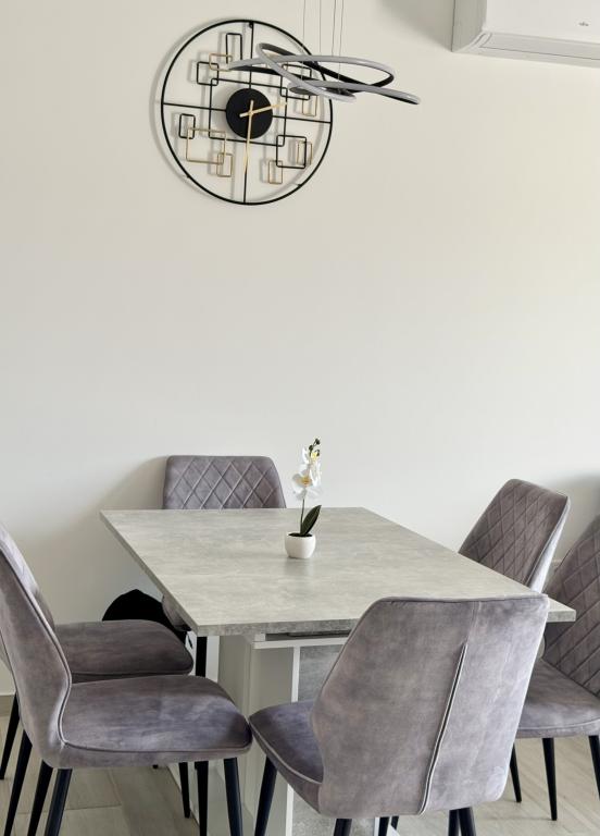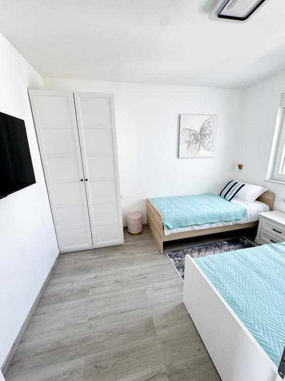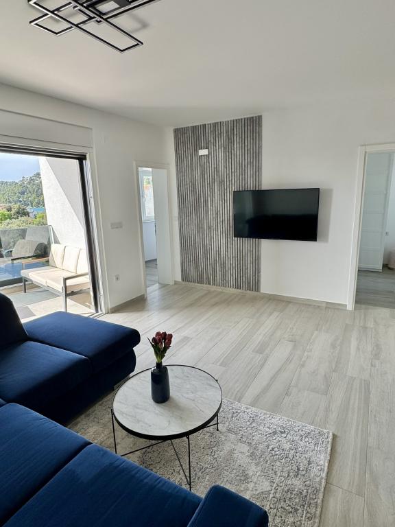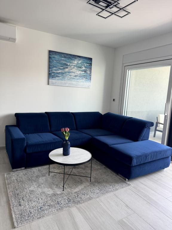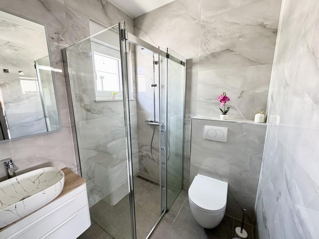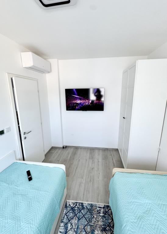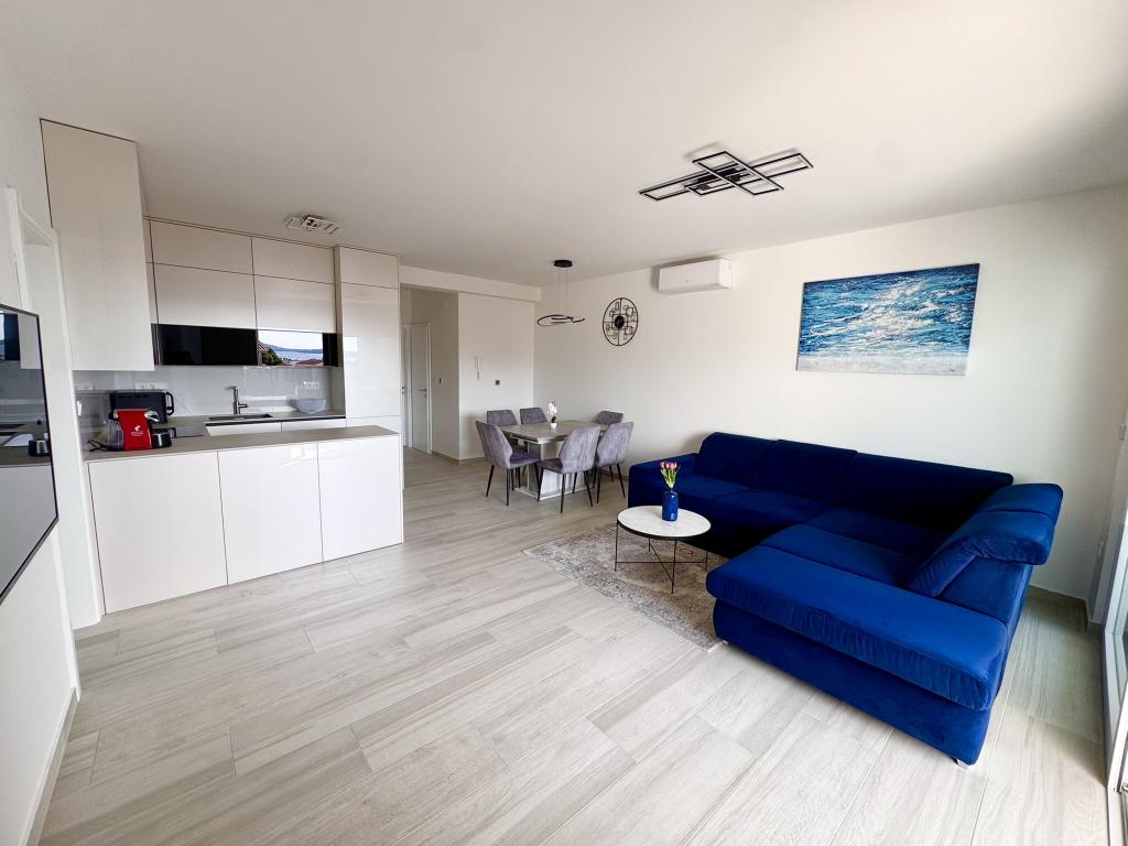 Appartement moderne neuf de 73 m², deux chambres, deux salles de bains, toutes les pièces sont climatisées et équipées d'une télévision. Seul appartement au deuxième étage avec vue sur mer.