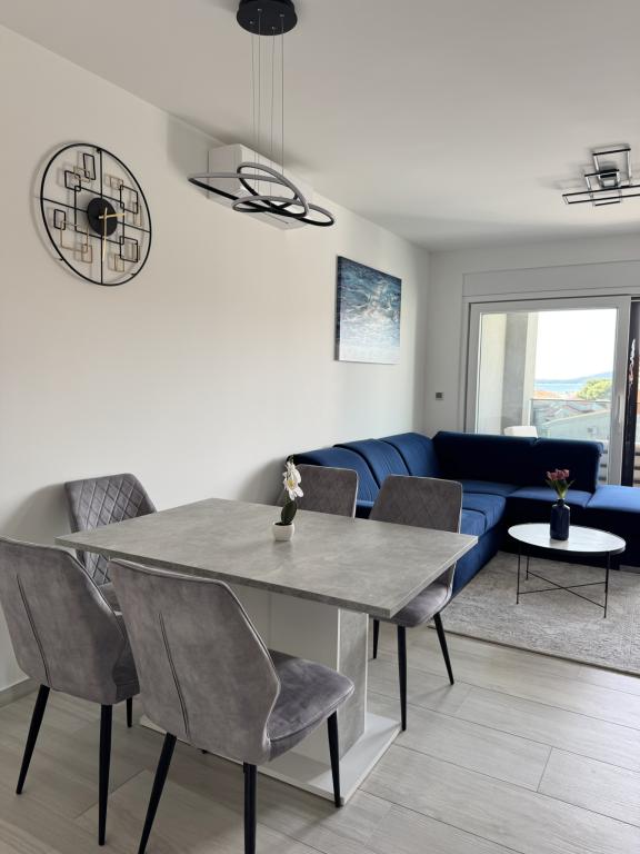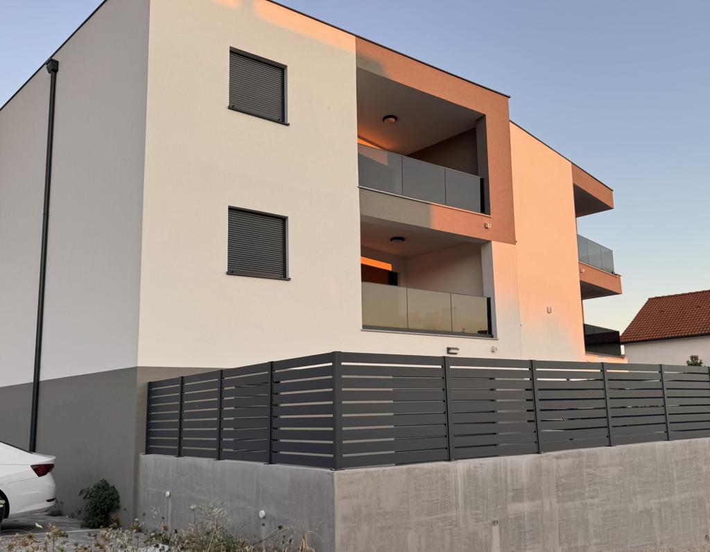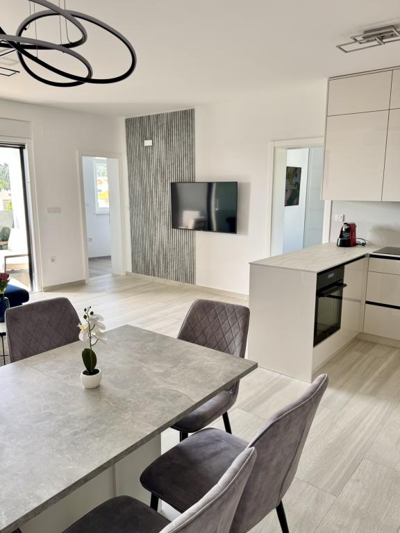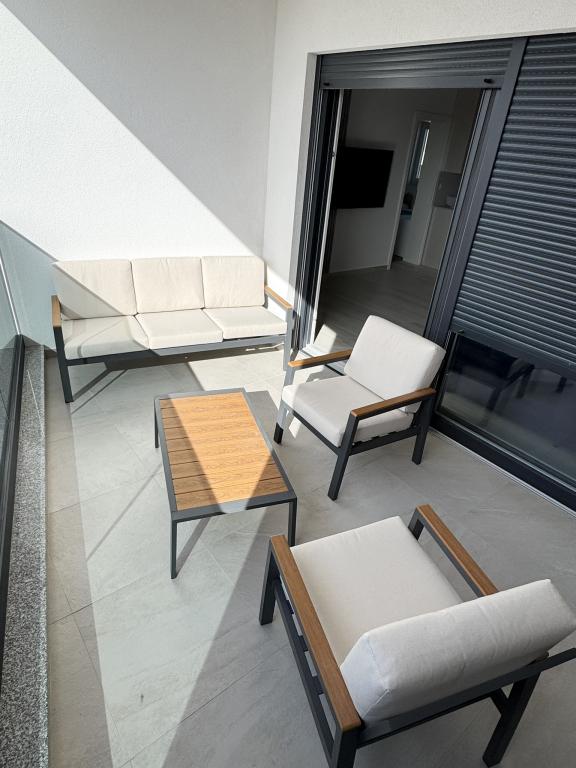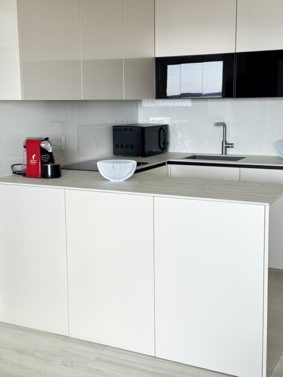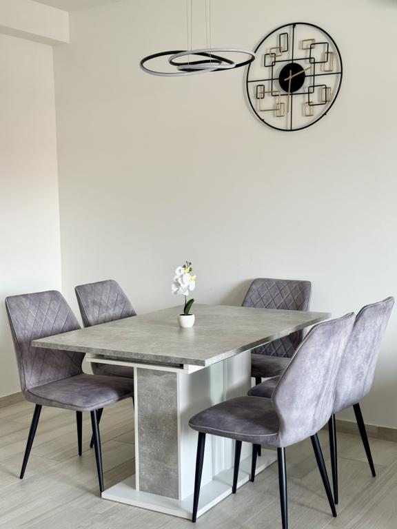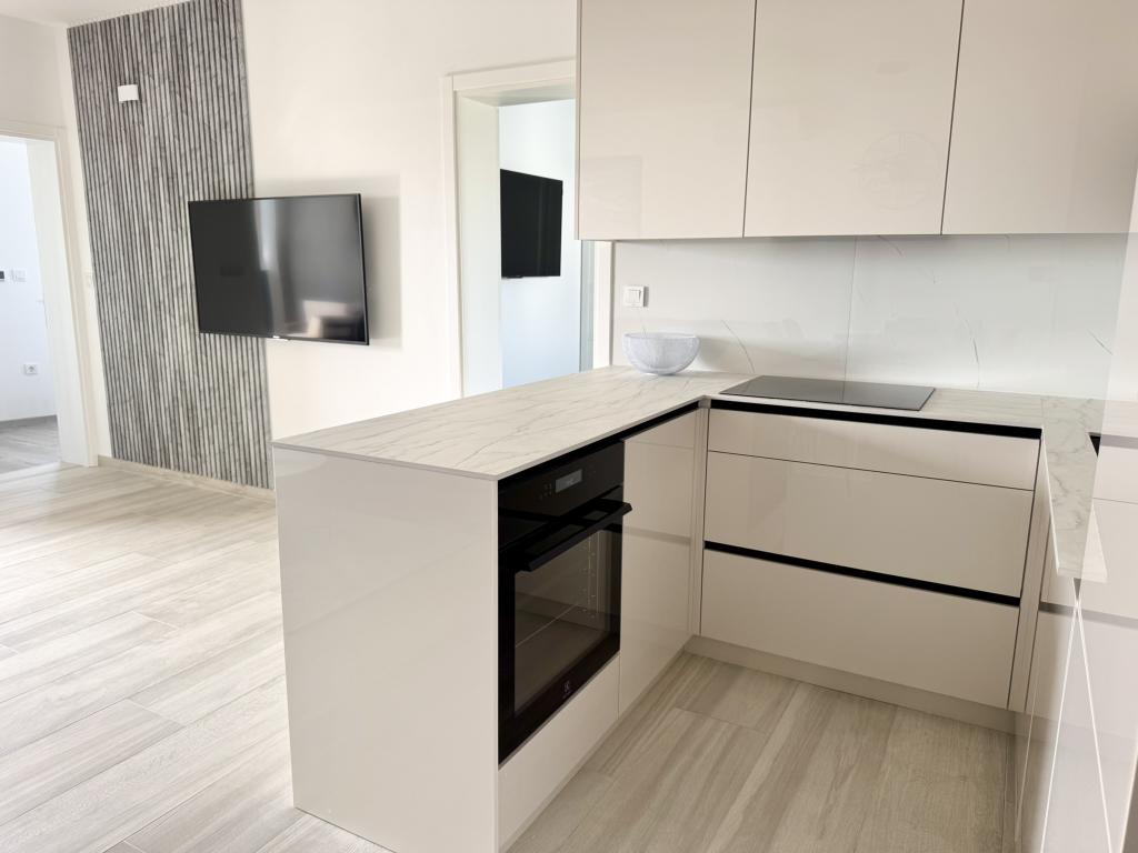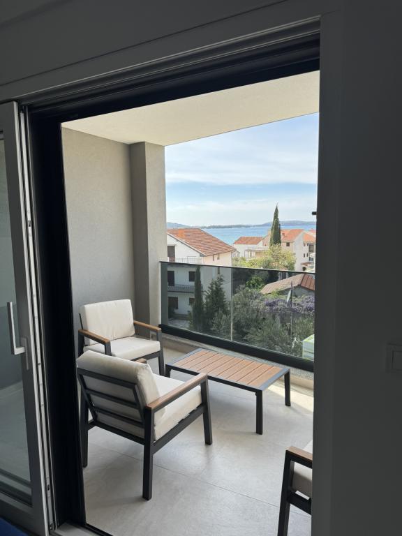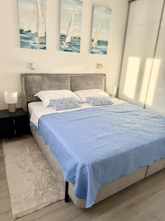 Appartement moderne neuf de 73 m², deux chambres, deux salles de bains, toutes les pièces sont climatisées et équipées d'une télévision. Seul appartement au deuxième étage avec vue sur mer.