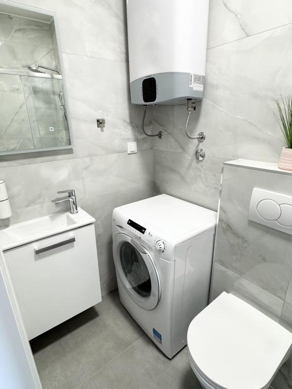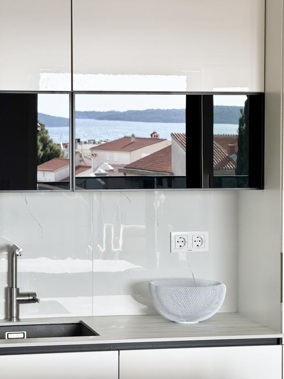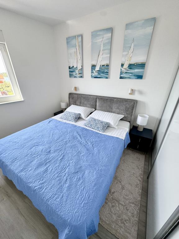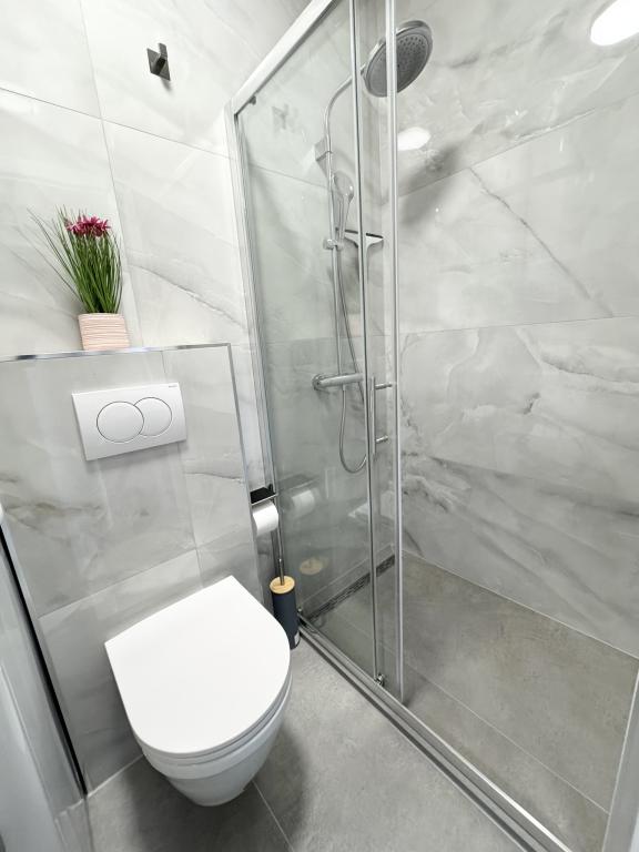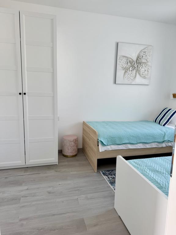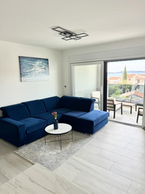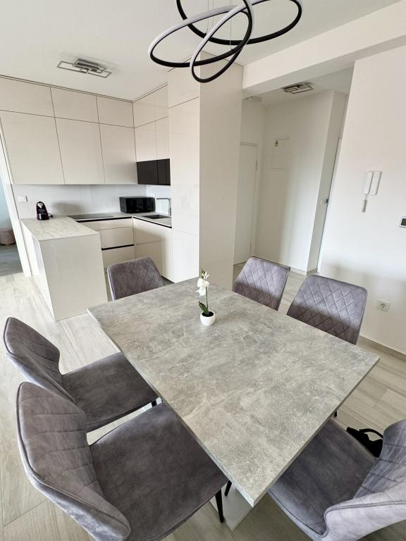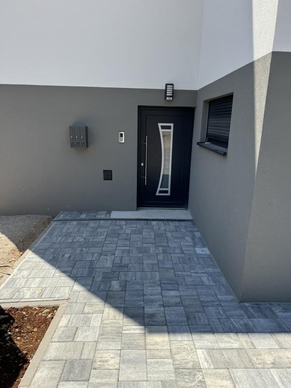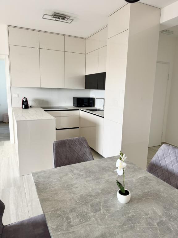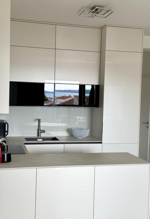 Appartement moderne neuf de 73 m², deux chambres, deux salles de bains, toutes les pièces sont climatisées et équipées d'une télévision. Seul appartement au deuxième étage avec vue sur mer.