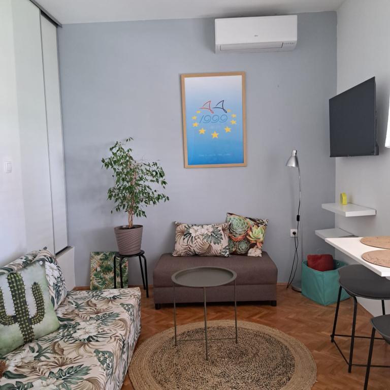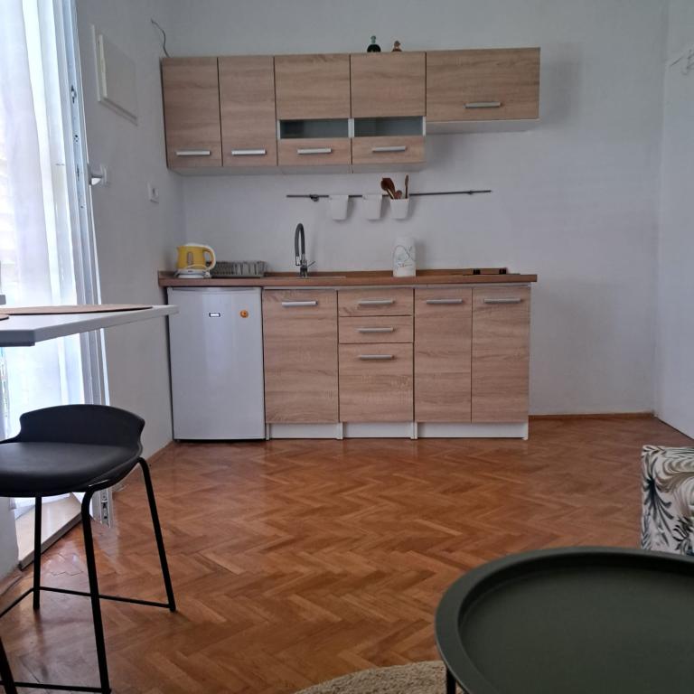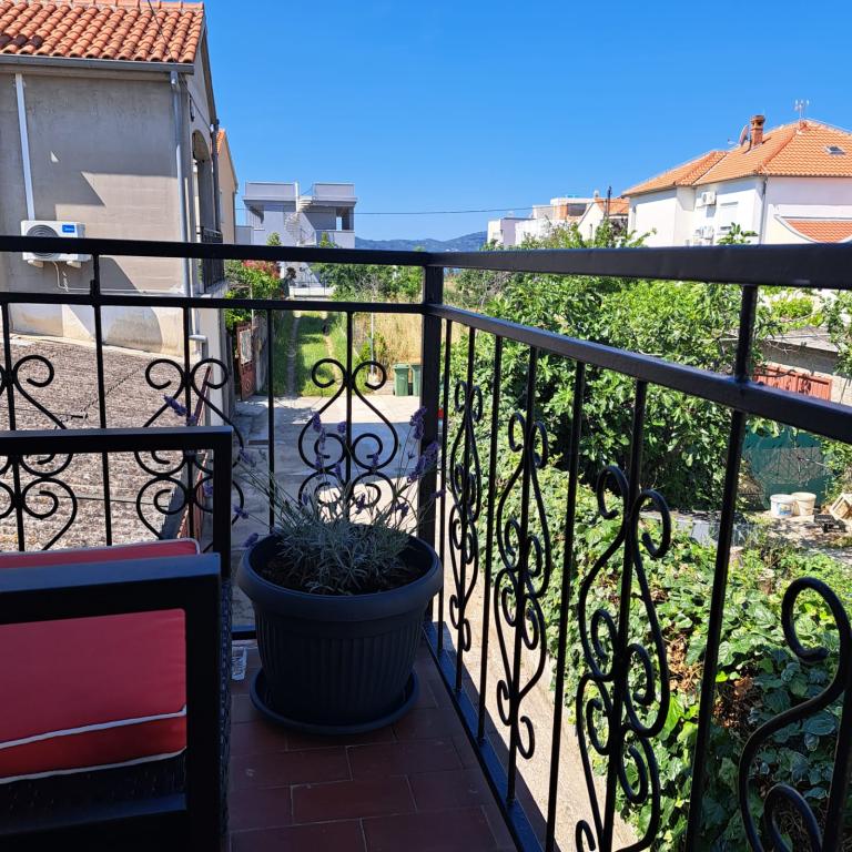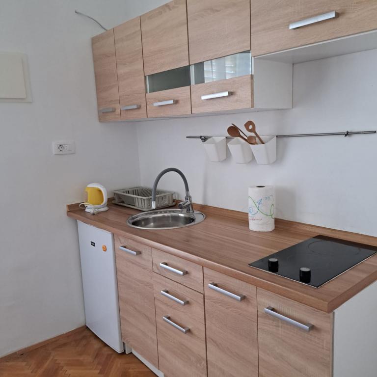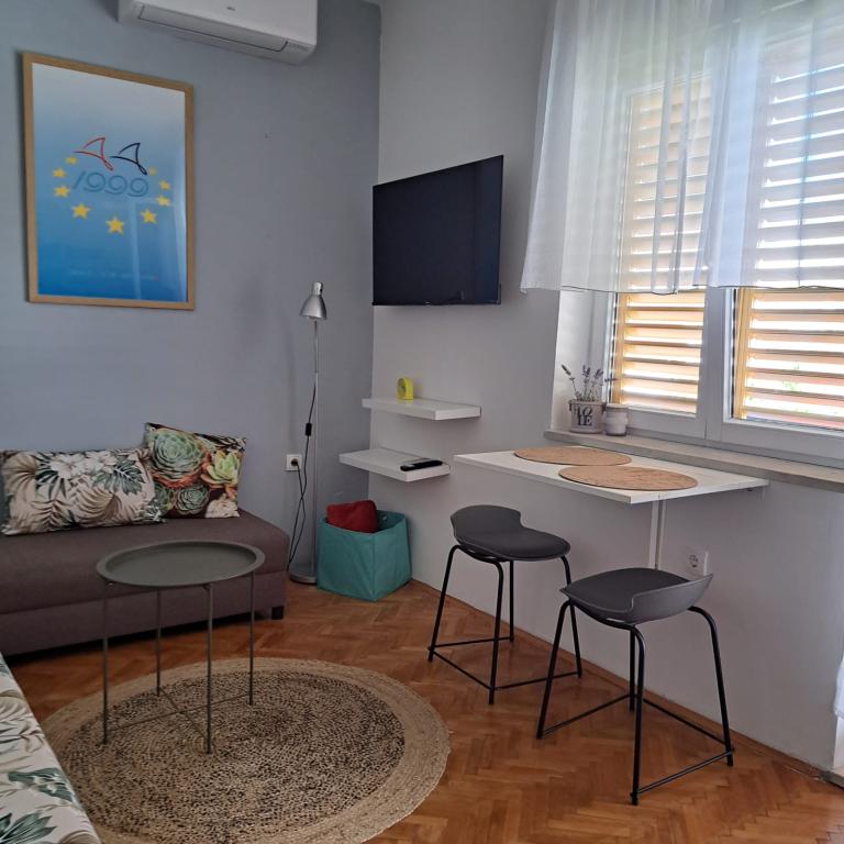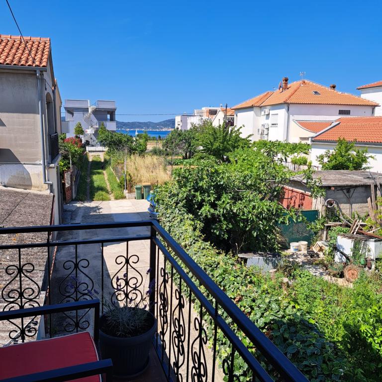 Appartement entièrement équipé dans un quartier calme de Zadar avec vue mer. Le bâtiment est situé à 300 mètres de la mer et à 400 mètres de la plage la plus proche. Le centre est à environ 1 kilomètre et le chemin menant au centre peut être traversé par une magnifique promenade (Karma et Kolovare) le long de la mer. L'appartement est prévu pour deux personnes, et se compose d'une chambre avec sortie sur le balcon, d'un spacieux séjour avec cuisine et d'une salle de bain (douche, lave-linge...). Il y a une vue sur la mer depuis le balcon.