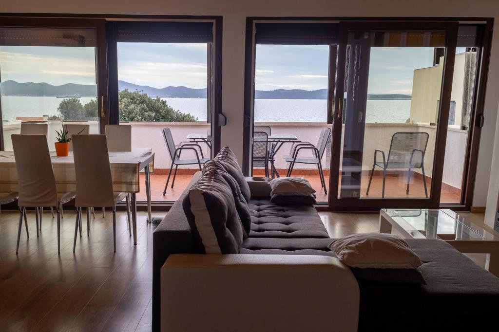 Spacieux appartement de 3 pièces (100 m²) au 2ème étage de la maison rustique Anica, située dans le quartier paisible de Diklo, à seulement 6 km du centre de Zadar et à 100 m de la mer. L'appartement comprend un grand séjour/salle à manger (38 m²) avec télévision par satellite, climatisation et accès à une terrasse avec vue sur la mer. Deux chambres confortables offrent un hébergement flexible : l'une avec un lit double, l'autre avec un lit simple et un lit double, et une salle d'eau privative avec WC. Toutes deux sont climatisées et donnent accès à une terrasse. La cuisine ouverte entièrement équipée comprend un four, un lave-vaisselle, une plaque vitrocéramique, un micro-ondes et une machine à café. Une salle d'eau supplémentaire avec WC et un lave-linge sont à la disposition des hôtes. Trois terrasses exposées plein sud, meublées, offrent une vue sur la mer et sont idéales pour se détendre. Les hôtes bénéficient d'un accès à un grand jardin clos avec pelouse, une aire de jeux pour enfants avec balançoires et un parking privé.