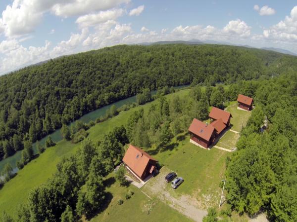 Entièrement équipée et moderne de vacances dans la nature intacte sur la rivière Mrežnica. Louer trois maisons en bois. Chacun est 140 m2. A l'étage, trois chambres au rez-de-chaussée salon, cuisine et terrasse. Après une salle de bain au premier étage et rez de chaussée. La cuisine est entièrement équipée. Les clients peuvent utiliser le gril. En plus de la maison est un terrain de jeux pour le football, le volley-ball et de badminton. En face d'une grande terrasse est une piscine de 10x4 m. Adaptation de la promenade le long de la rivière. Nous louons des kayaks et des vélos de montagne. Les aliments peuvent être commandés à l'avance.