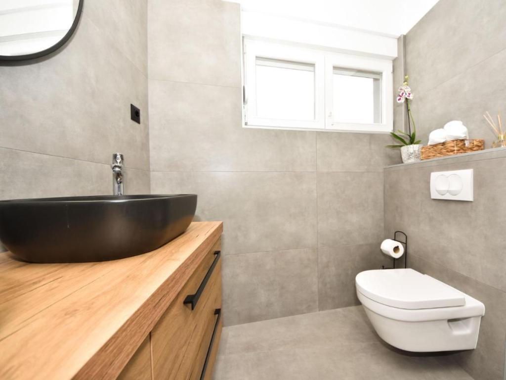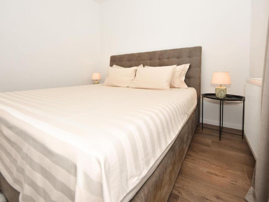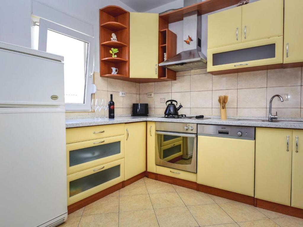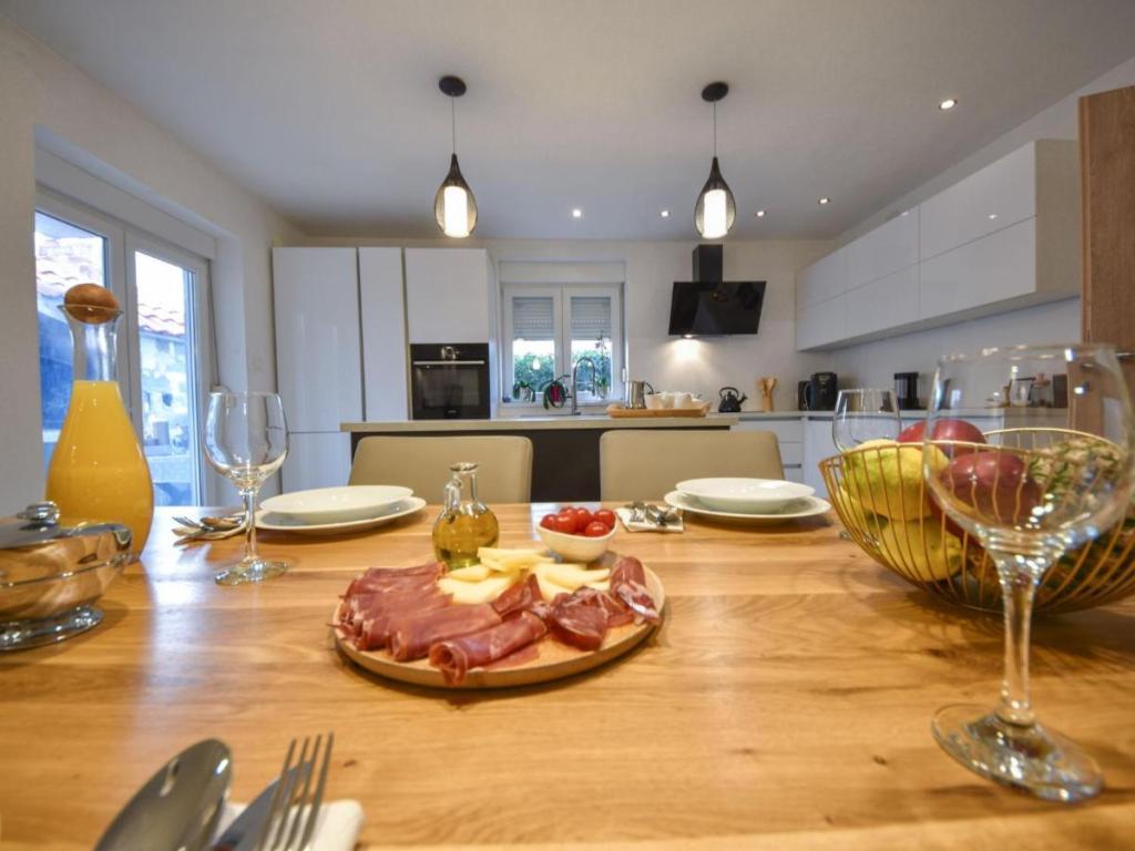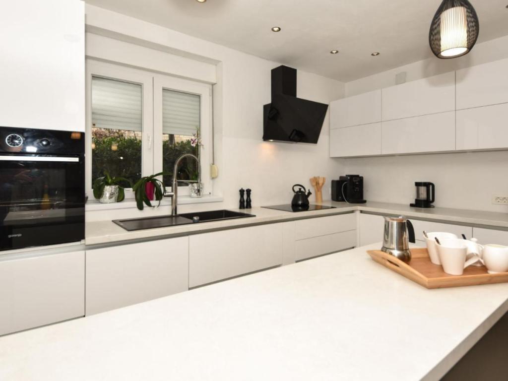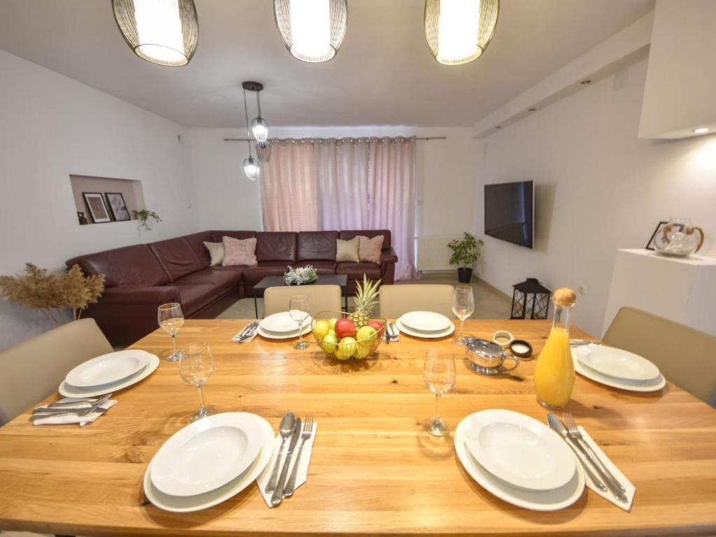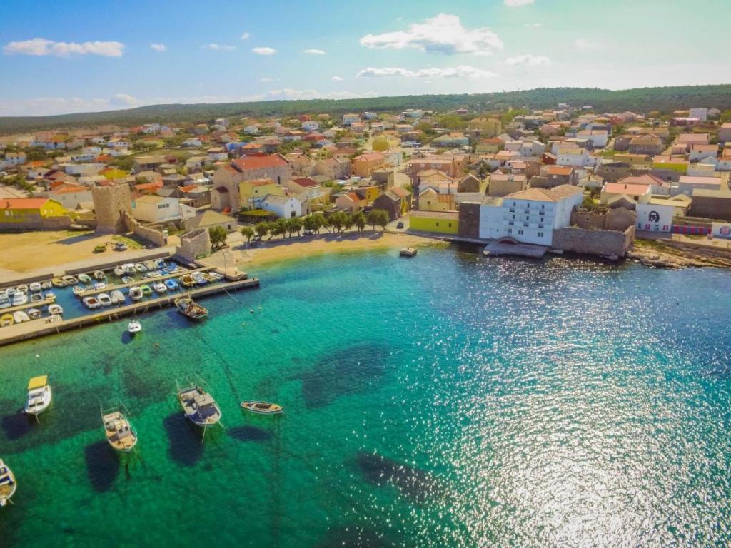 Maison individuelle « Villa Matino », sur deux niveaux. À 400 m du centre de Ražanac, dans un emplacement calme, ensoleillé et en hauteur, à 440 m de la mer et de la plage. À usage privé : terrain de 500 m² (clôturé), piscine d'angle (8 x 4 m, 32 m², profondeur 145 cm, ouverte du 15 mai au 15 octobre) avec escalier intérieur. Douche extérieure, barbecue, entretien de la piscine assuré par le propriétaire/jardinier. Dans la maison : accès internet gratuit, lave-linge. Parking pour 3 voitures sur la propriété, attenant à la maison. Le propriétaire n'accepte pas les groupes de jeunes. La maison est équipée de 4 climatiseurs. D'une superficie totale de 250 m² répartie sur deux niveaux, elle se compose de deux appartements loués ensemble (idéal pour les groupes car ils offrent à la fois un espace privatif et une pièce commune). L'appartement 1, plus petit, comprend 2 chambres (chacune avec un grand lit double de 180 x 200 cm), 1 cuisine, 1 salle à manger, 1 salon, 1 salle de bains et 3 terrasses (dont 2 avec vue sur mer). Il est équipé d'une grande télévision, d'une connexion internet gratuite dans tout l'appartement et d'un lave-linge.