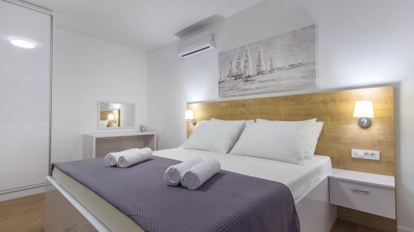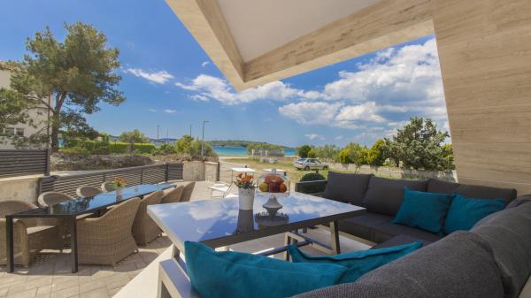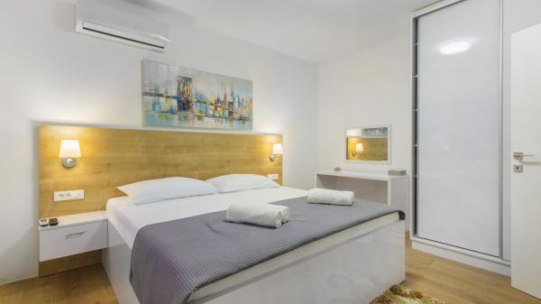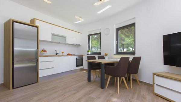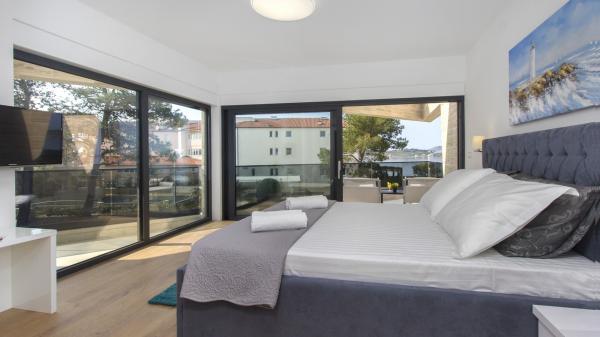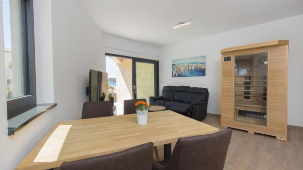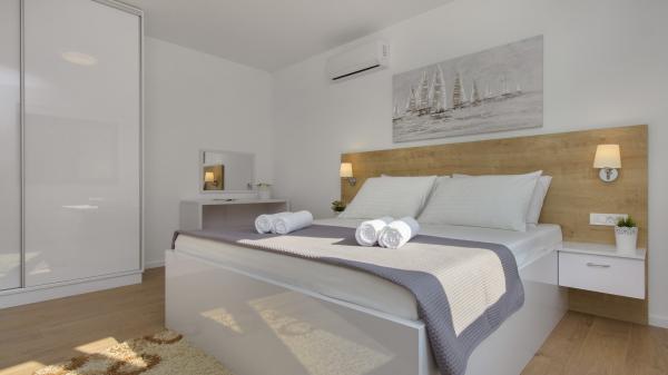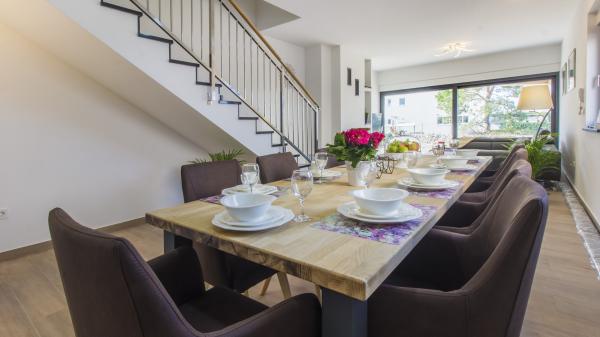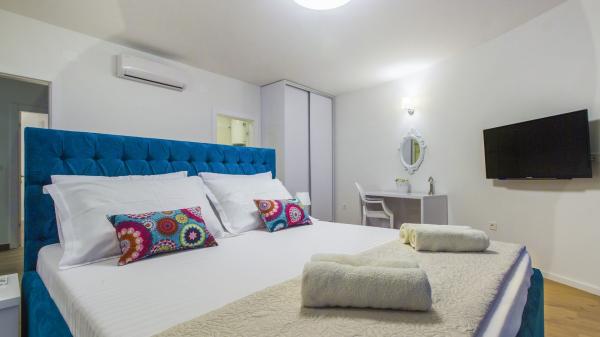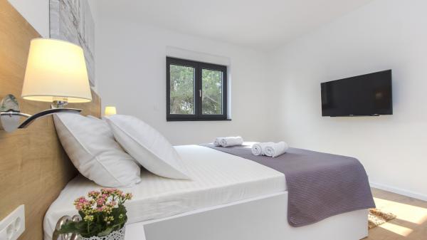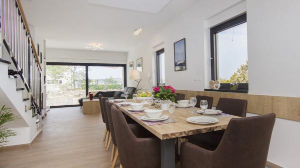La Villa Okit est une villa moderne et récemment construite, située à seulement 50 mètres de la plage de sable de Srima, à 3 km de Vodice et à 13 km de Šibenik. Au rez-de-chaussée, vous trouverez une cuisine, un salon et une salle de séjour qui forment une unité et une salle de bains séparée. Depuis le salon, vous trouverez une terrasse et une cour paysagée avec mobilier de jardin et solarium. La cuisine est entièrement équipée avec les ustensiles nécessaires et une kitchenette pour préparer les repas et les boissons. Au rez-de-chaussée se trouve également un appartement séparé avec une chambre à coucher, une salle de bains, une cuisine et une salle à manger où vous pouvez sortir de la cour. Au 1er étage de la maison il y a 4 chambres à coucher et 3 salles de bain. Chambre 1, 20m2 avec salle de bain privée et sortie sur balcon, lit 180X200, TV. Chambre 2, 25m2, avec salle de bain privée et sortie sur balcon, lit 180X200, TV. Les chambres 3 et 4 ont une salle de bain commune de 15m2, chacune avec un lit de 180x200, une commode et une télévision. Cour clôturée avec solarium et salon de jardin, place de parking.